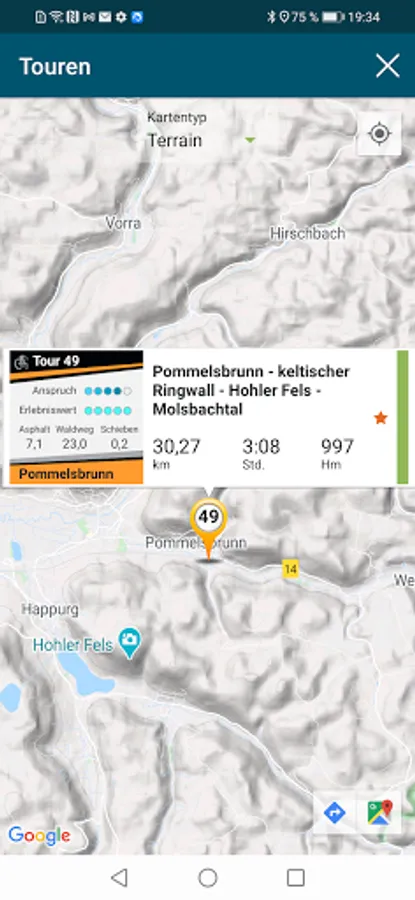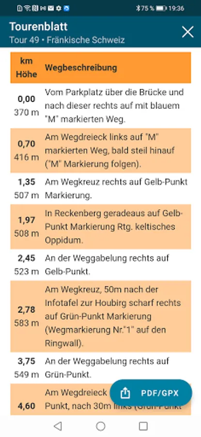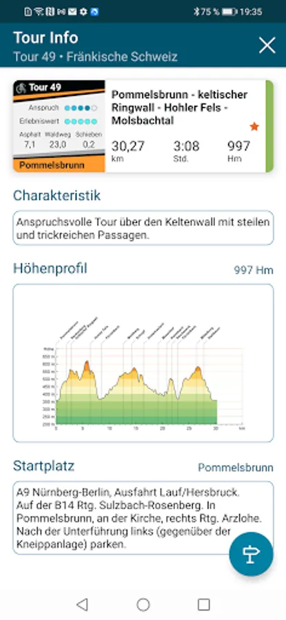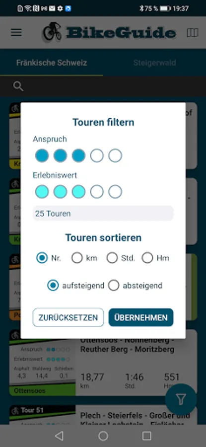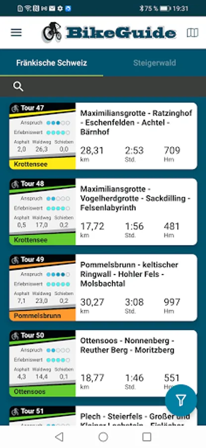 The app offers 73 tours in Franconian Switzerland and 15 tours in the Steigerwald with directions, elevation profiles and map data. The tours can be sorted and filtered according to starting point, level of difficulty or experience value. They are clearly shown, the difficulty of which is easy to recognize by the color.