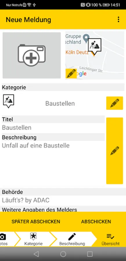 The “Running ?! - by ADAC “is a reporting system that you can use to report defects in the street to your ADAC regional club and thus actively improve road safety in your city. The defects classified into categories such as potholes or defective street lighting are checked by the ADAC and forwarded to the responsible authority or municipality. The position and the processing status of the request at ADAC are shown on a map. Further information - such as the currently participating regional clubs - can be found on adac.de under the search term "Defect reporter".
