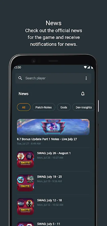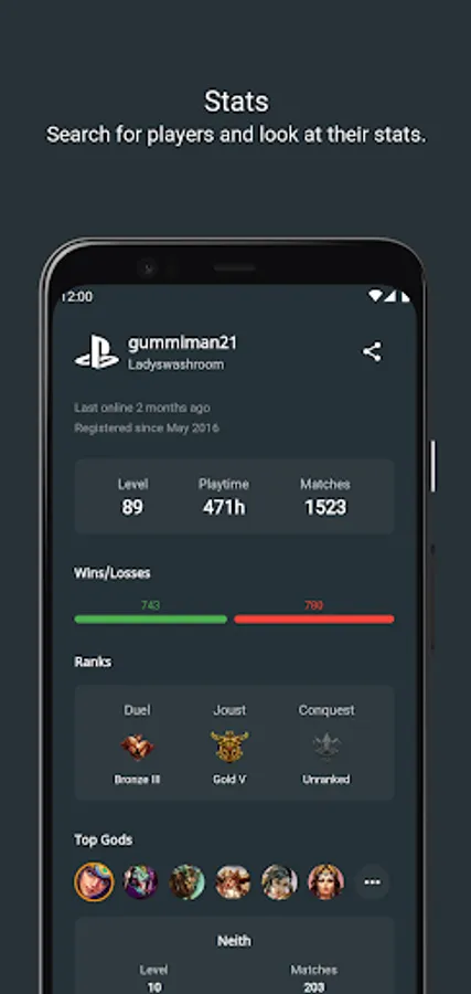- View statistics (levels, gods, matches, etc.) of players