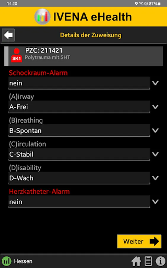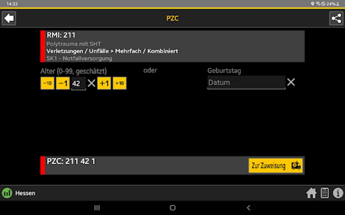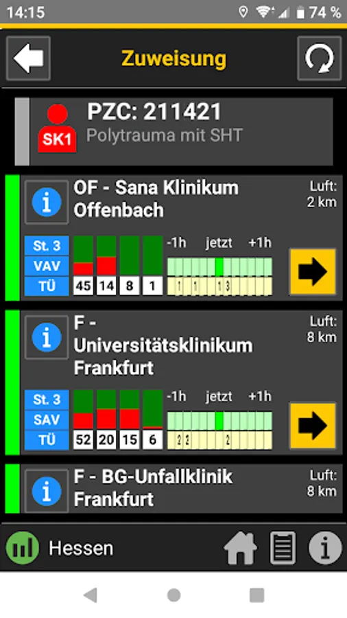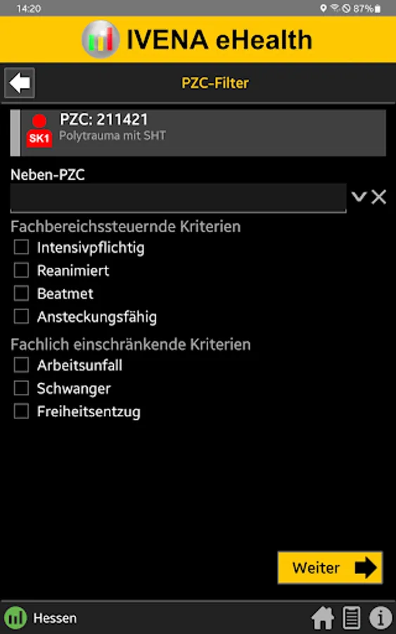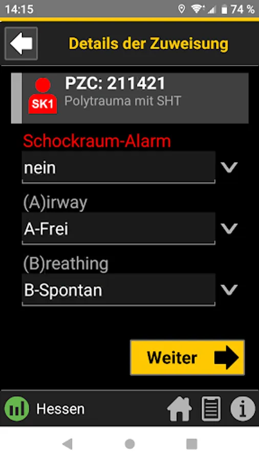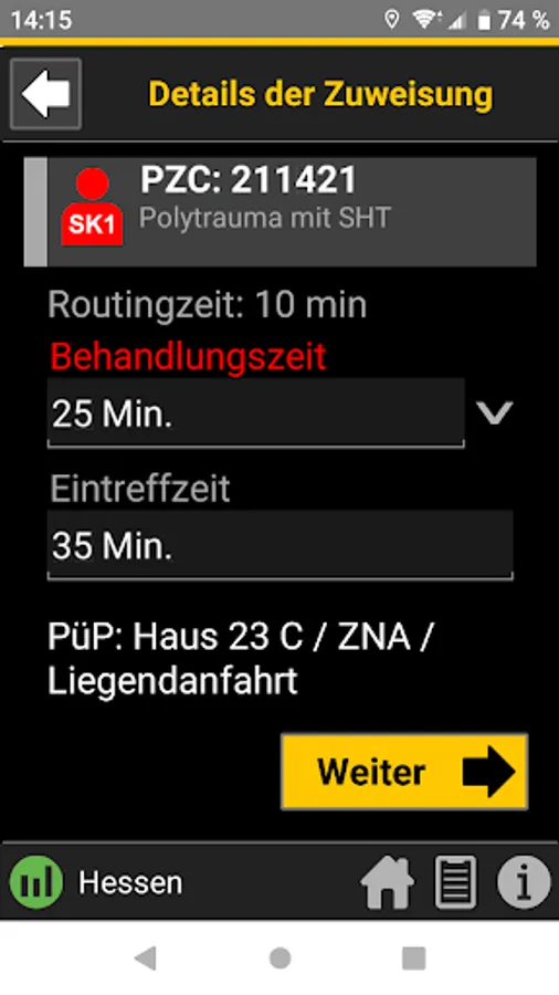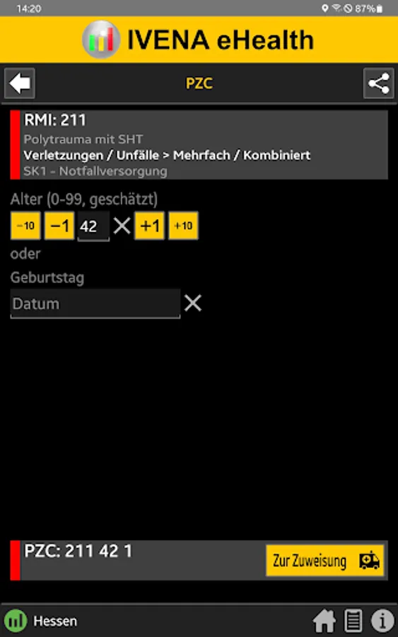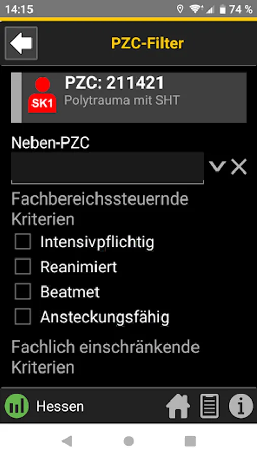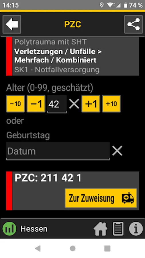 When the central control center is deployed, the rescue service transmits the initial diagnosis using the so-called PZC (patient assignment code). This app helps EMS personnel determine the correct PZC. If login data is available, the patient can be referred directly to a suitable hospital.