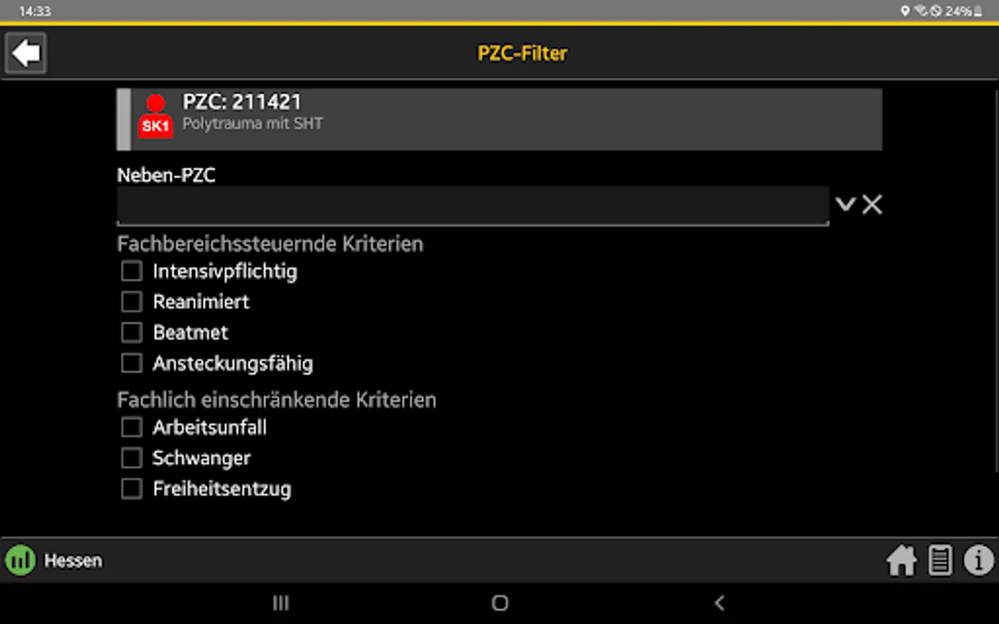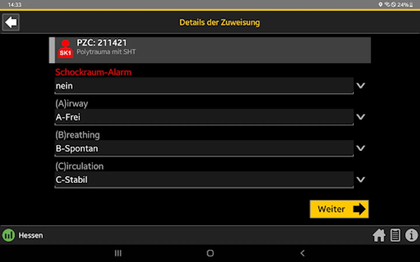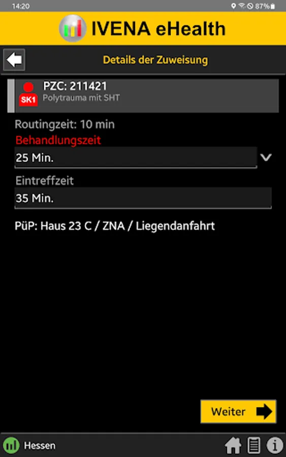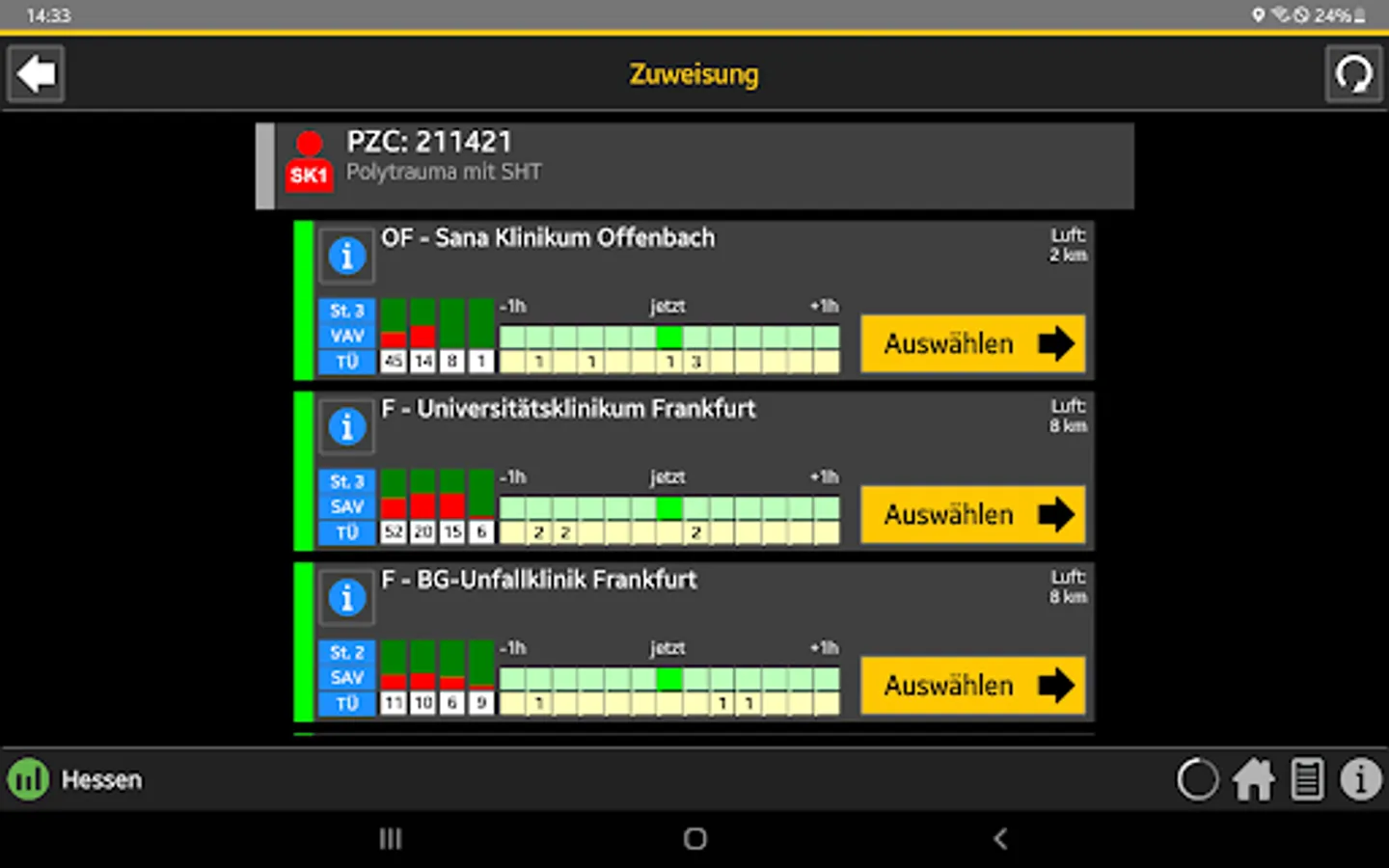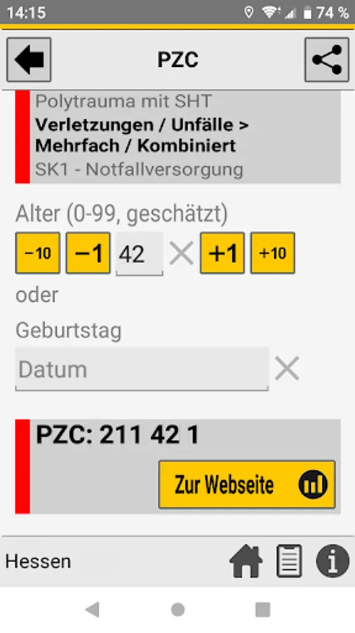 When the central control center is deployed, the rescue service transmits the initial diagnosis using the so-called PZC (patient assignment code). This app helps EMS personnel determine the correct PZC. If login data is available, the patient can be referred directly to a suitable hospital.