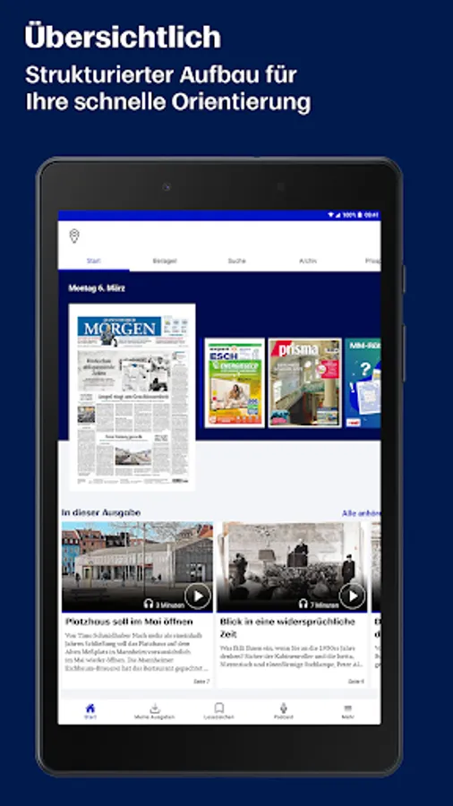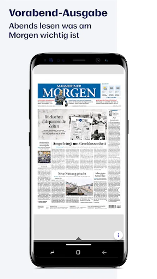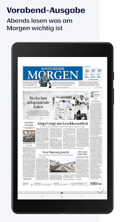 With the e-paper app you can read the Mannheimer Morgen conveniently on your tablet or smartphone. Only in the e-paper app can you read the next day's newspaper edition in the evening. So you are well informed before everyone else!