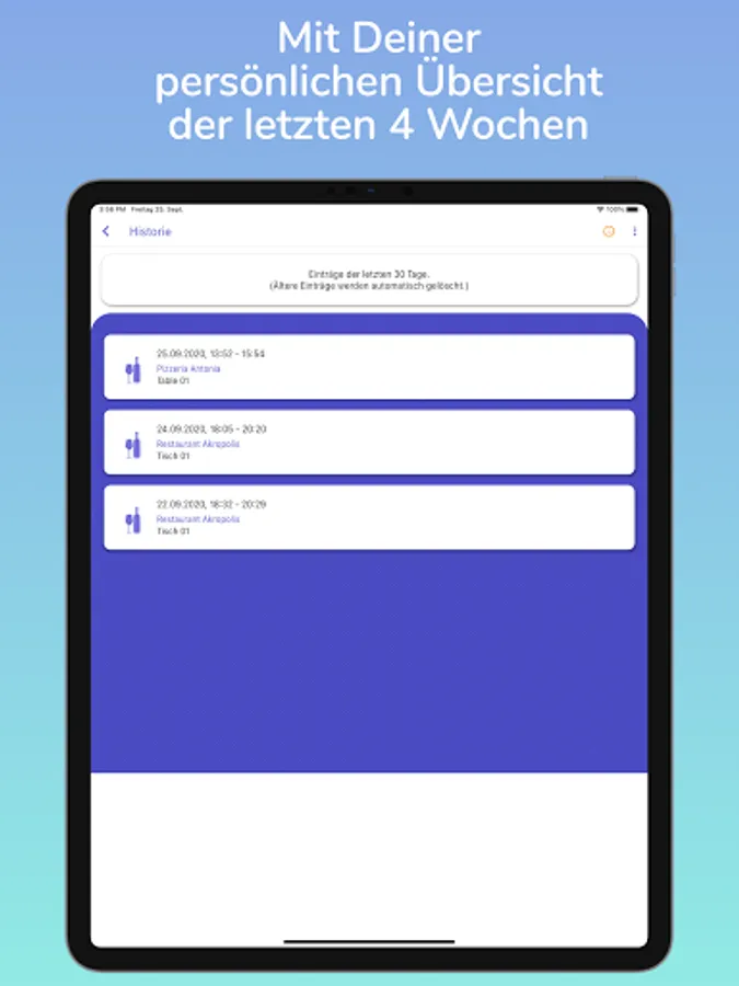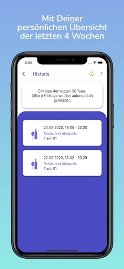 Here you can keep an eye on the visits of the last 4 weeks. The information where you were checked in is encrypted with your personal private key, which is only available on your device. So only you can read the data.