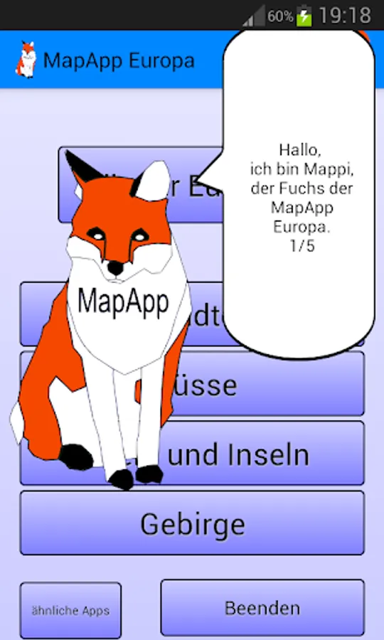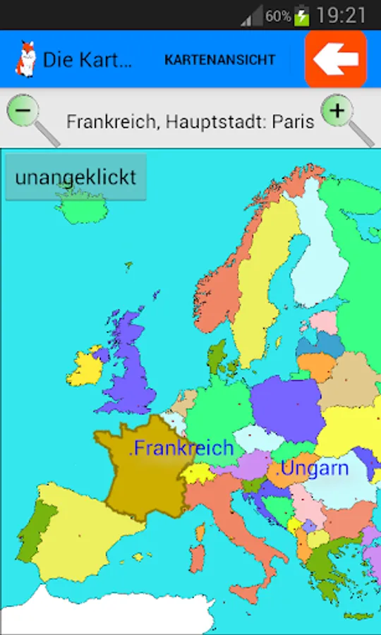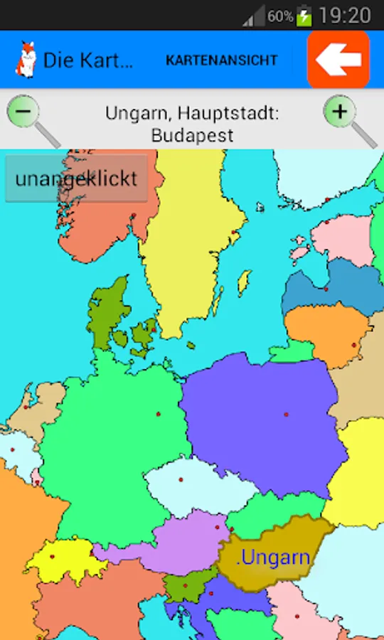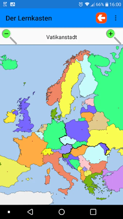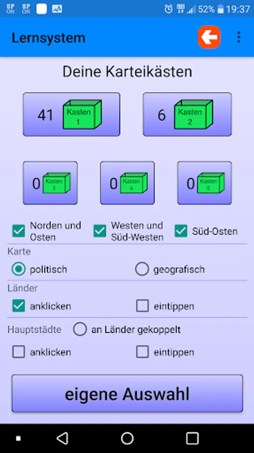 2) There is also a Learning category. There is a pre-made card box, which allows you to learn the countries without haste. Again you can choose for themselves whether only the countries, only the main cities, together or to be learned separately from each other. False answered countries or capitals are again put back into the box. 1 Correctly answered questions are set to the next higher box ascending up box. 5 So you can estimate well what you have to learn and what you have mastered all right.