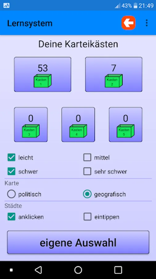 2) There is also a learning category. There is a prefabricated card index box that you can use to study without rushing. Again you can choose whether you want to be queried by simply pointing, tapping the card or typing in the correct answer. Incorrectly answered questions are put back in Box 1. Correctly answered questions are placed in the next higher box in ascending order to box 5. This is a good way of assessing what you still have to learn and what you have already mastered well.