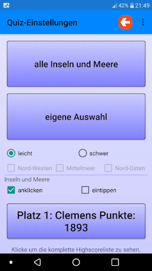 The seas and islands are initially at an easy level of difficulty. The queried islands are also outlined so that they can be found more easily. The difficult level is divided into regions. Bays and smaller seas, such as the Adriatic Sea in the Mediterranean, are also queried here. Sometimes you have to zoom in well to find smaller islands.