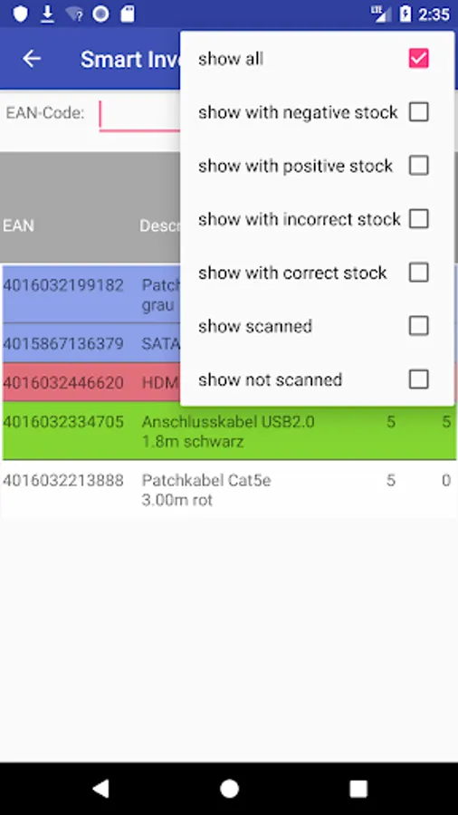 Color highlighting of items (correct stock, positive / negative stock, non-scanned items) facilitates the overview of their stock / inventory or picking. Let yourself, for example, during picking, you only see the items whose stock is incorrect (positive or negative stock), so you can see directly which items still have to be picked and which items have been picked too many.