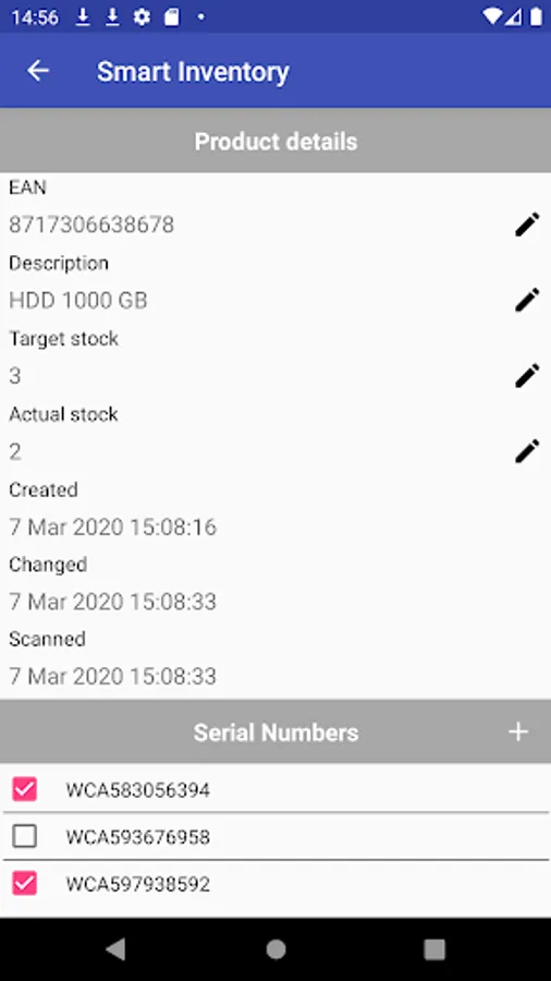 You can also edit the data of the articles (Store, Rack, EAN code, article number, description, product group, target / actual stock, price) of course. The inventories are stored locally, so that internet access is only necessary to load the files to be imported onto your smartphone or to send the exported inventories.