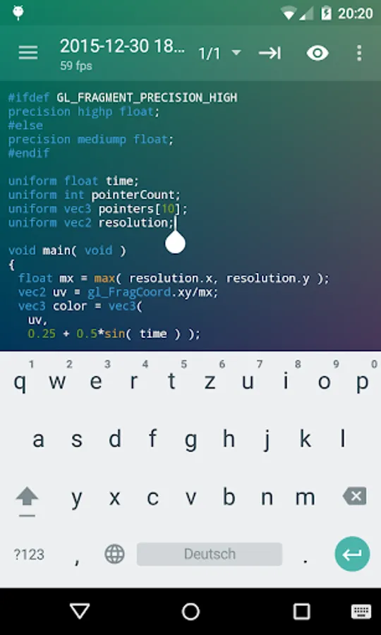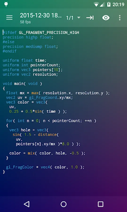 Some devices limit GPU usage to consume less power when not plugged in. Always check the performance with the soft keyboard hidden and the power cord off. A shader should make at least around 30 fps to not slow down the UI if you intend to use it as a live wallpaper.