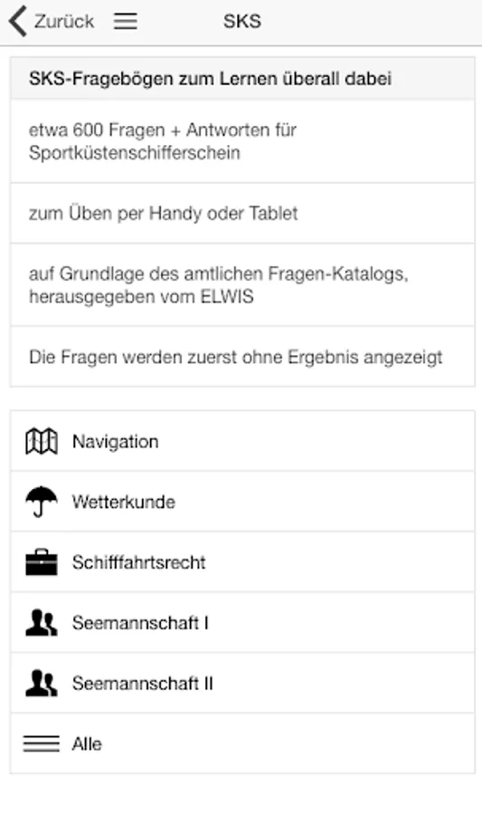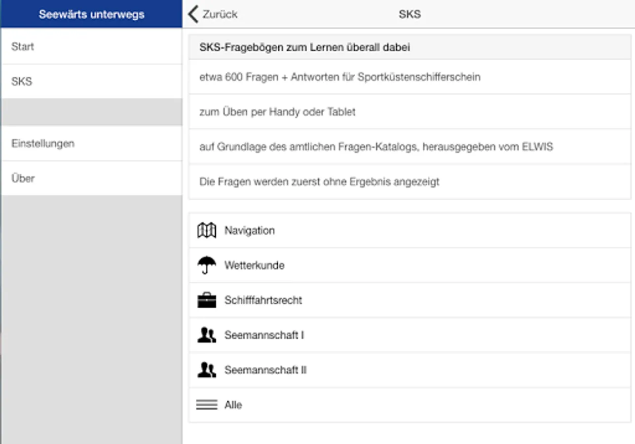 Su is the official exam questions you are learning for the exams for the Sportbootführerschein inland (motor + sail), Sportbootführerschein See and the Sportküstenschifferschein .. The app included and also available on the exam paper mode, the arches in the wording of the questions and their sequence are identical to those in the test. Have you answered the question in mind, you can always test your solution and note whether your answer was correct. In the current multiple choice questions this is done automatically. So the current learning progress over a statistic is available, this applies to all responses as well as for individual questionnaires. Moreover, it is only possible to practice the wrong, correct or partly correct tasks or users to create a random sequence.