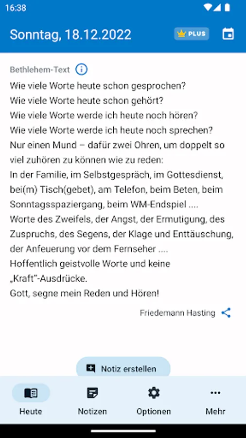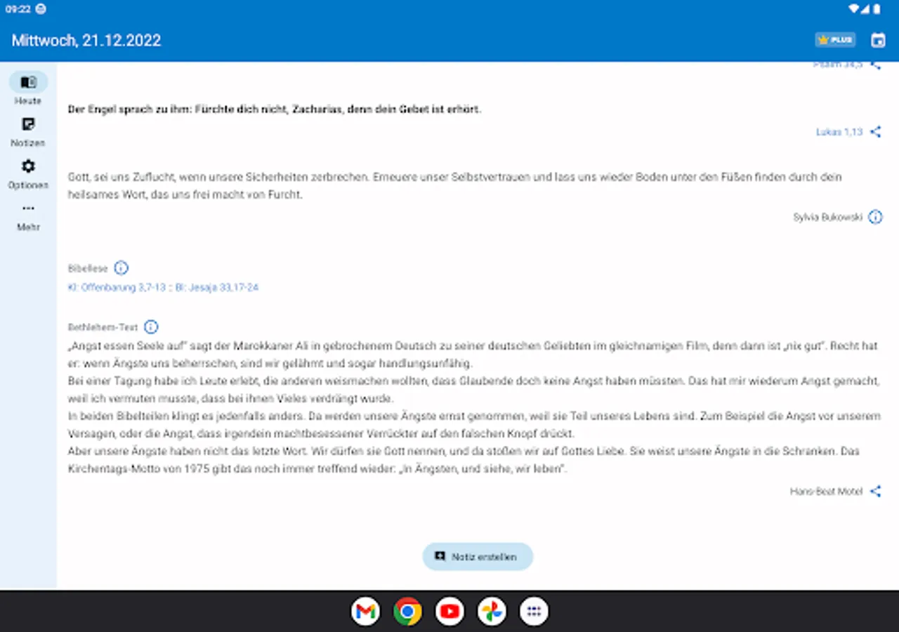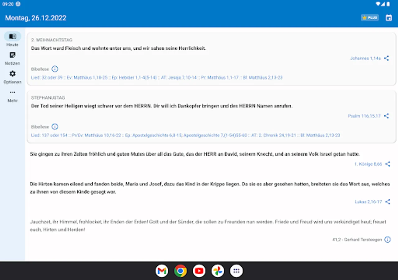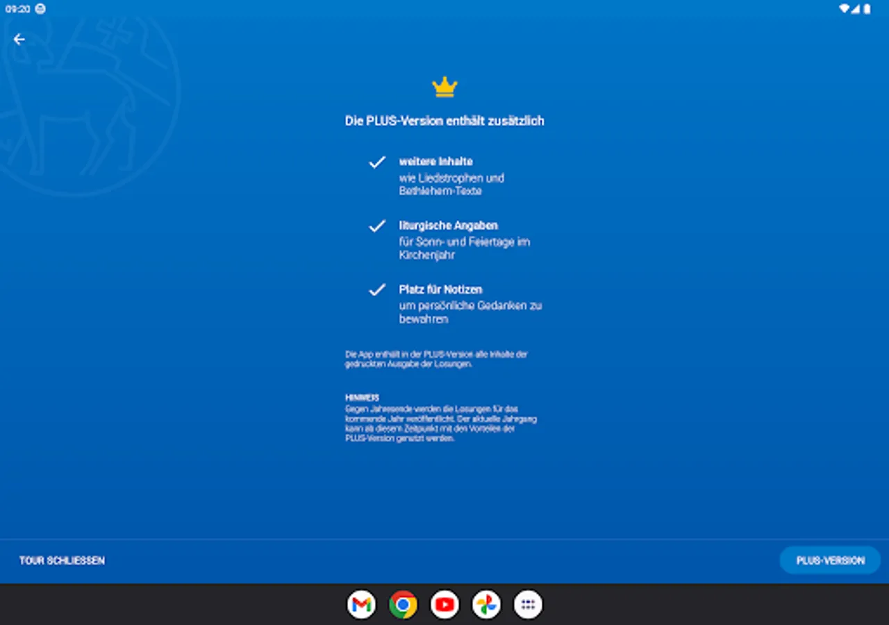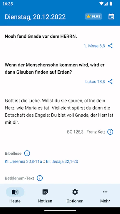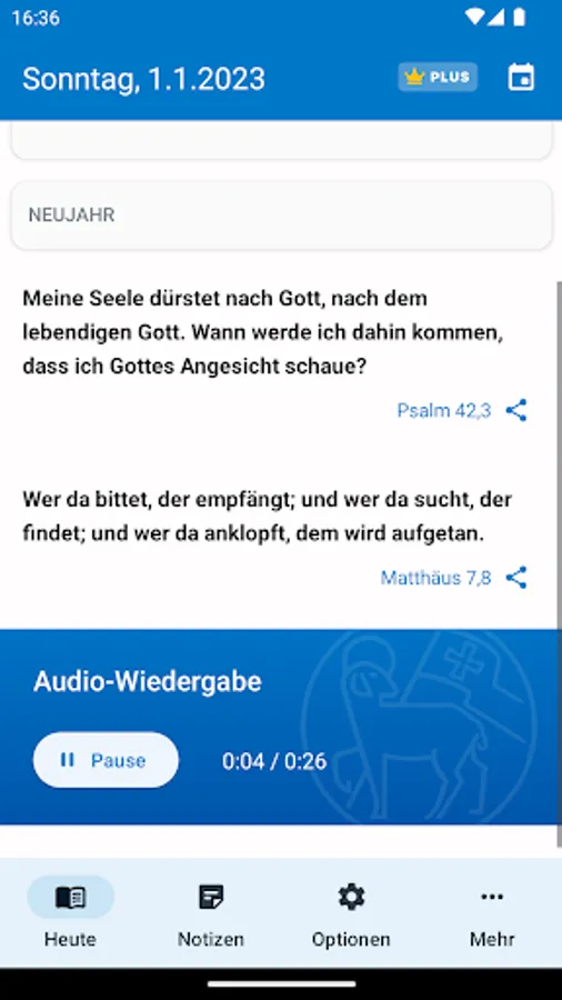 • An in-app purchase of €3.99 (Plus version) is required, which subsequently installs all the data for the respective year. It contains the motto and teaching text as well as the third text, reading of the Bible and all information on the liturgical texts of Sundays and feast days. All Bible passages are linked to m.die-bibel.de for reading the texts related.