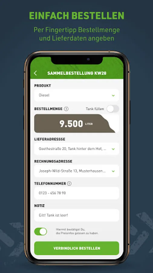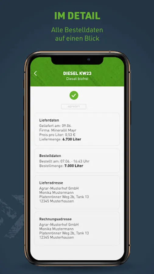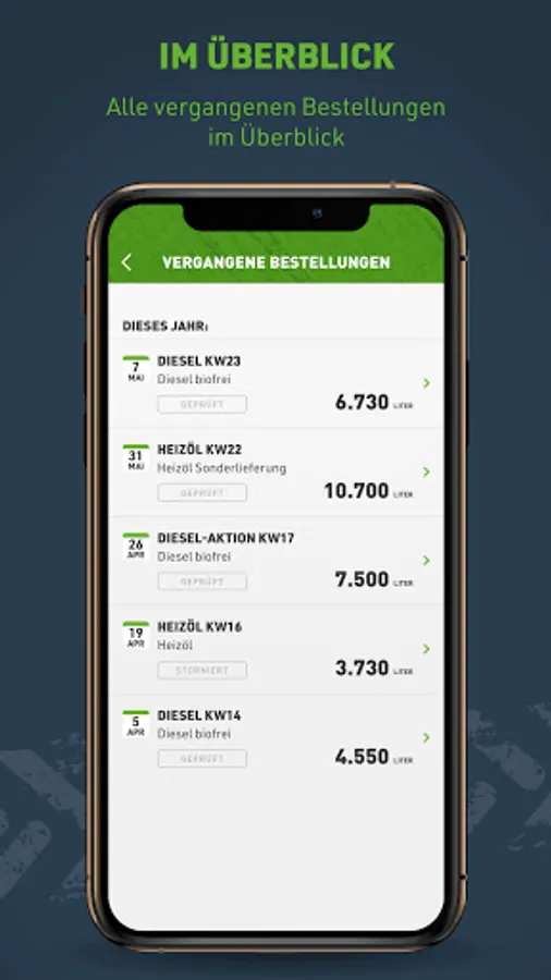 In addition to the selection and maintenance of various billing and delivery addresses, you have with the diesel app your current and past orders at any time at a glance.