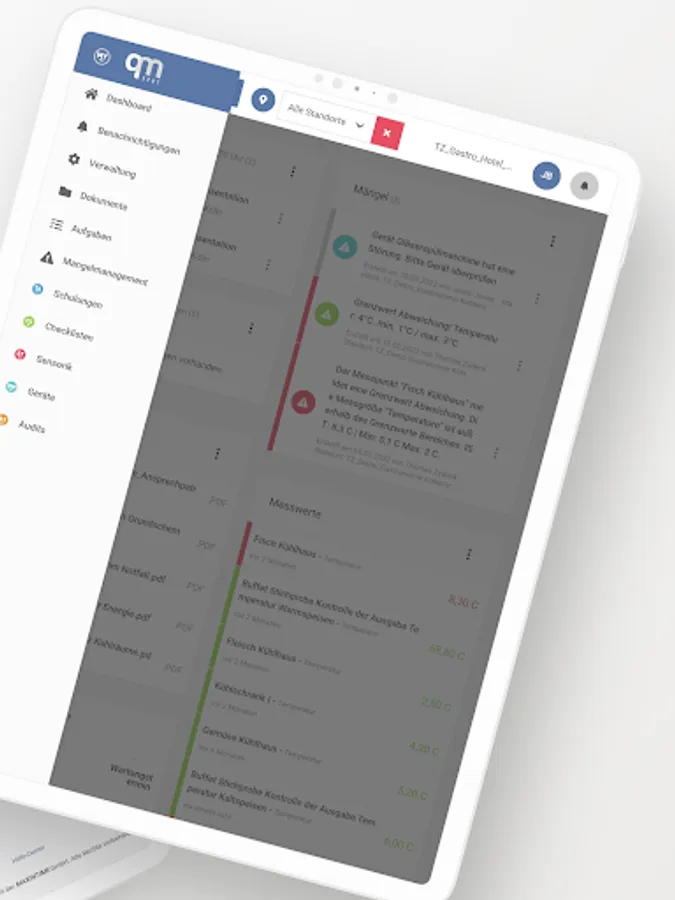 QMSpot enables you to easily keep track of all important parameters, such as recurring checklists, cross-site audits and evaluations, permanent sensor monitoring, systematic device management and the creation or recording of staff training and training statuses.