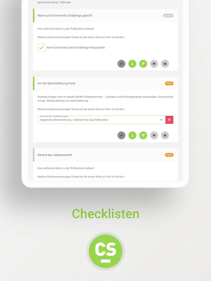 With this system, you can digitally display all operational checklists, whether cleaning lists or more complex processes such as lists of goods received, along with validation of the recorded data. Thanks to the CS module, you can provide your employees with cleaning schedules, work instructions and procedural instructions to help them carry out their tasks. All completed checklists are always automatically archived as a report and are available to you at any time for evaluation, comparison or external controls.