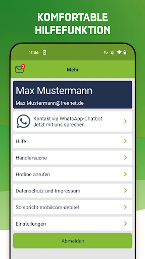 To use the app, log in with your email address and password, which you also use on our self-service portal on www.freenet-mobilfunk.de, or register today at www.freenet- mobilfunk.de/online-service/#/first-registration.