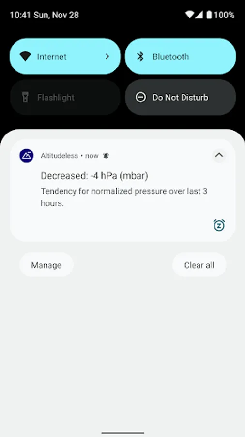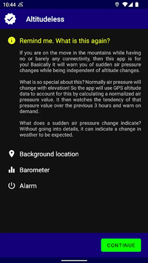 If you are on the move in the mountains while having no or barely any connectivity, then this app is for you! Basically it will warn you of sudden air pressure changes while being independent of altitude changes.