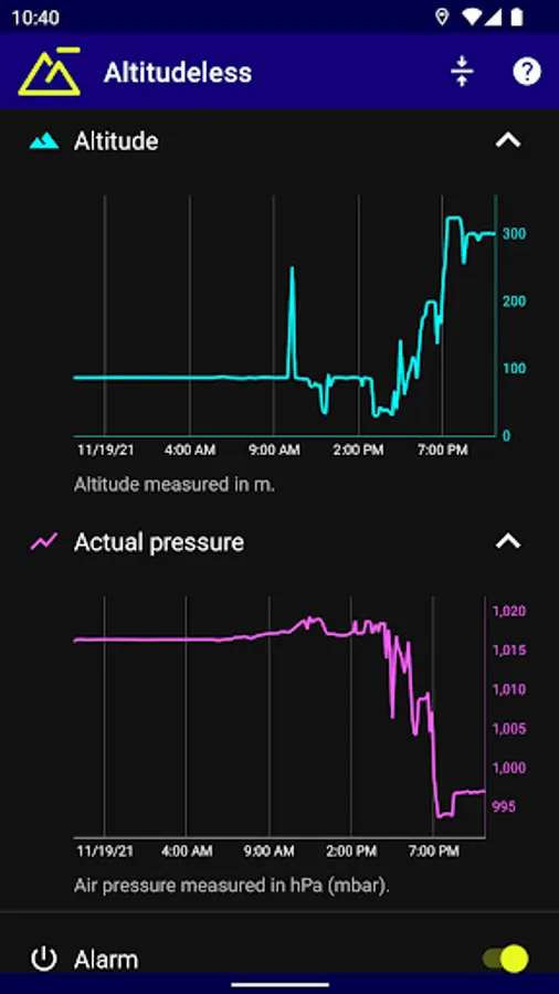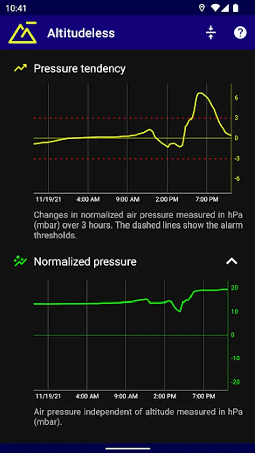 What is so special about this? Normally air pressure will change with elevation! So the app will use GPS altitude data to account for this by calculating a normalized air pressure value. It then watches the tendency of that pressure value over the previous 3 hours and warn on demand.