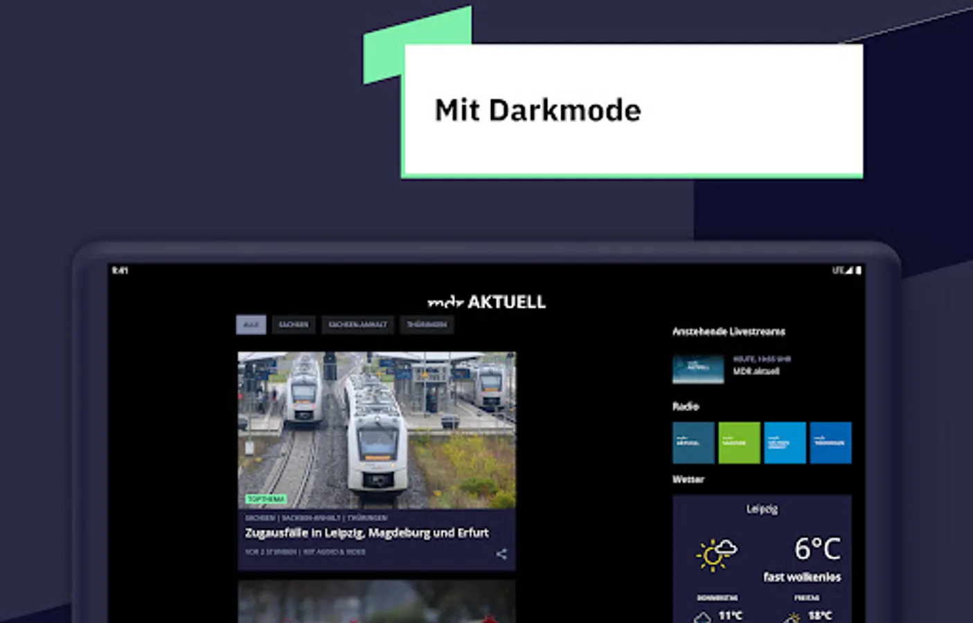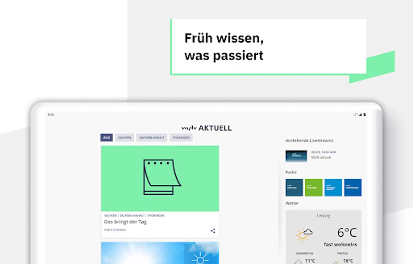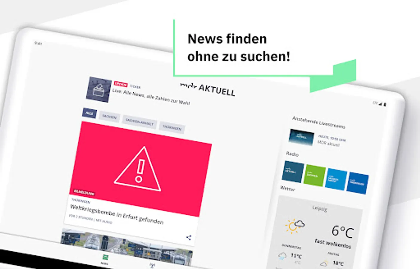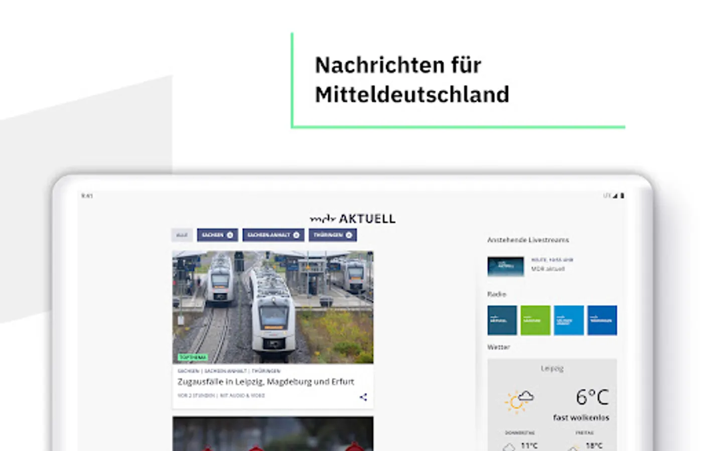 The free news app from MDR AKTUELL: We inform you quickly and competently about current events in the regions of Saxony, Saxony-Anhalt, Thuringia and the most important news from Germany and the world.