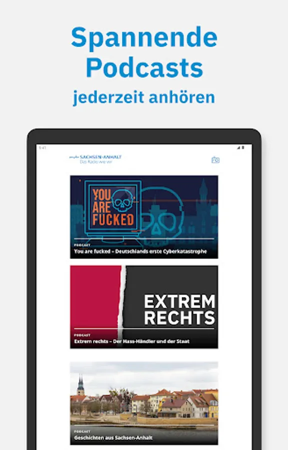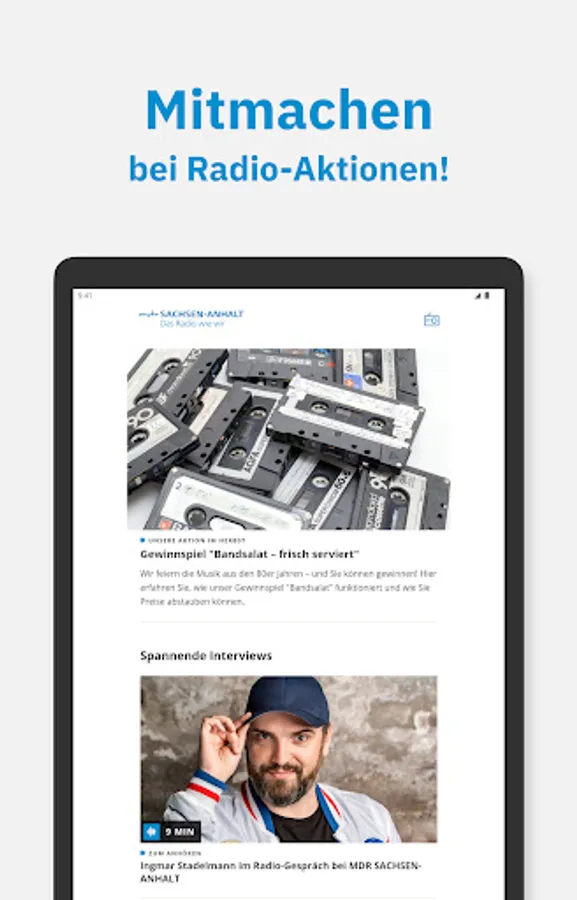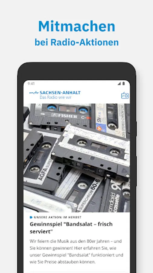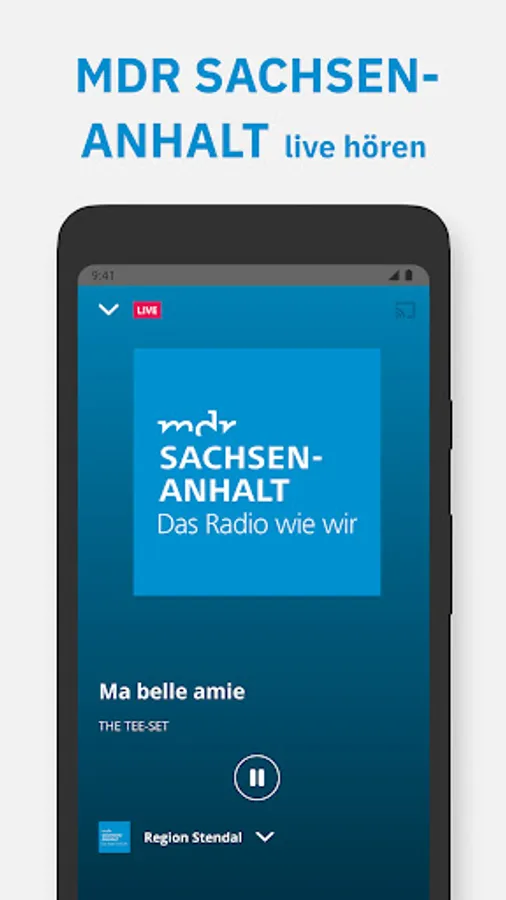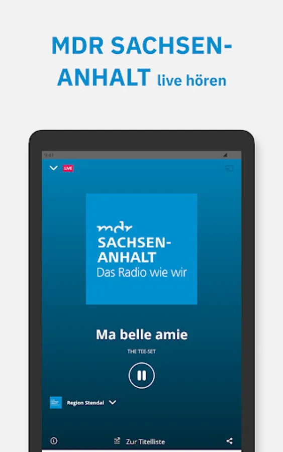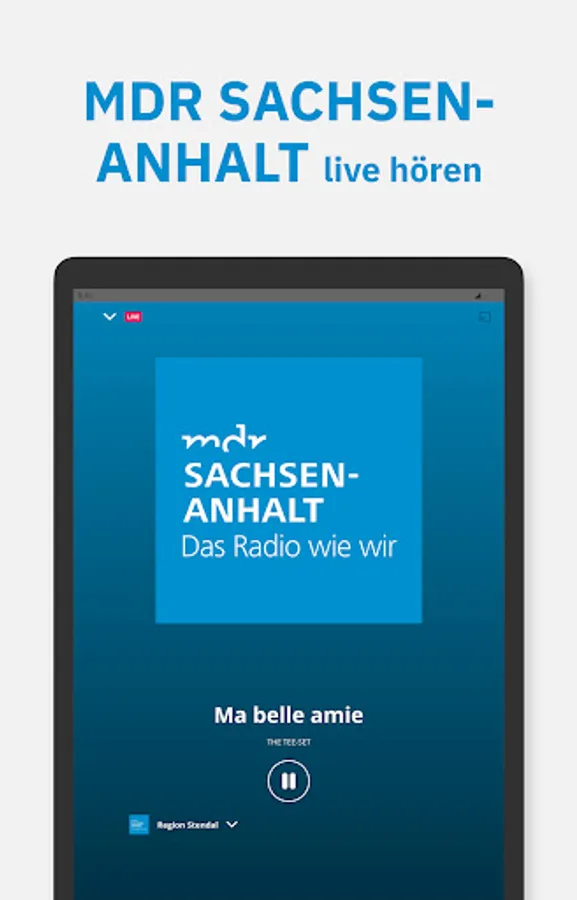 • Radio: We deliver daily in the live stream "MDR SACHSEN-ANHALT - The radio like us" directly to your smartphone. Choose between the regions of Halle, Magdeburg, Dessau and Stendal, or be inspired by our hit world. Of course including a title list.