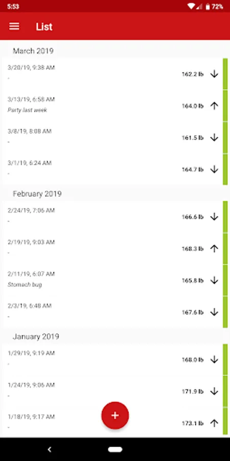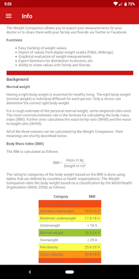 You can enter your measured weight as well as your waist and hip circumference. A concise list view shows the recorded values that you can always change later, as well as the Body Mass Index (BMI), the Waist-to-Hip ratio (WHR) and Waist-to-Height ratio (WHtR). Several textual and graphical analysis will give you a good insight into the history of your body weight as well as waist and hip circumferences.