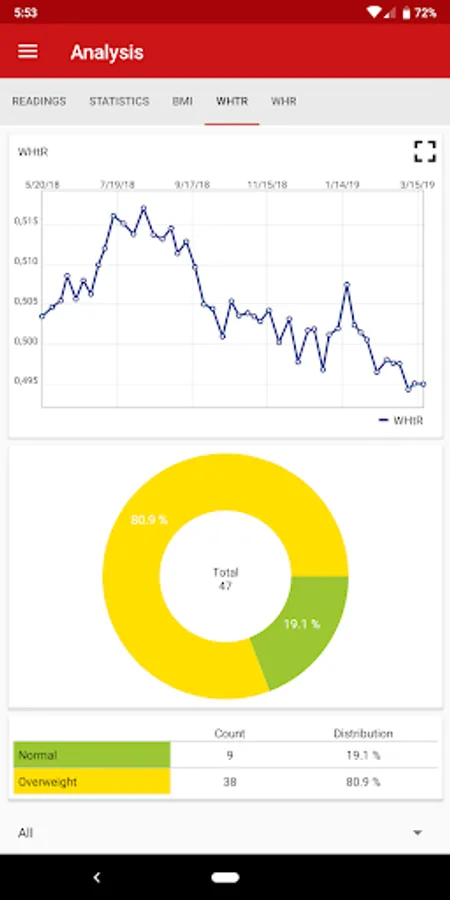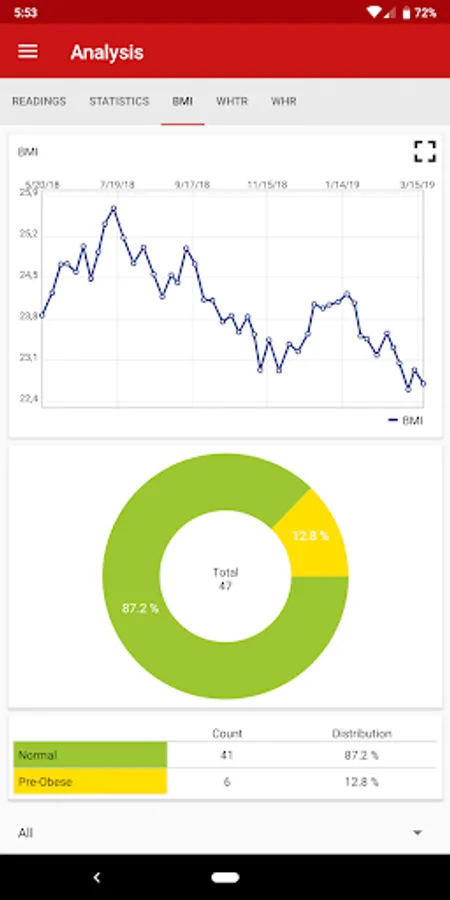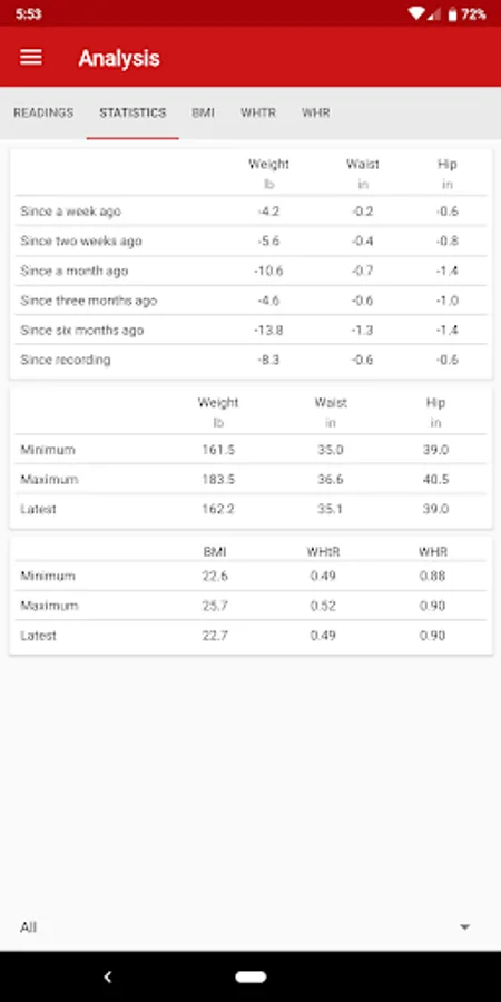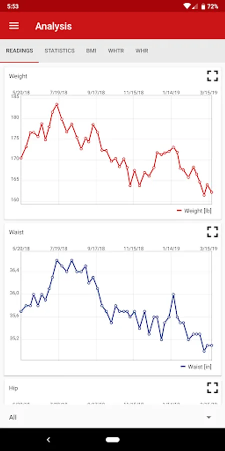 • Evaluate your measurements graphically, incl. BMI, WHtR, and WHR
