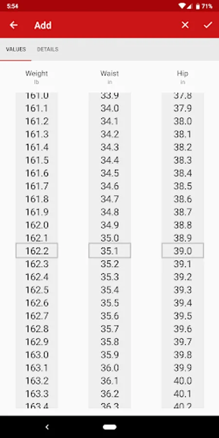 • Enter body weight (kg/lb), waist, and hip (cm/in) measurements quickly