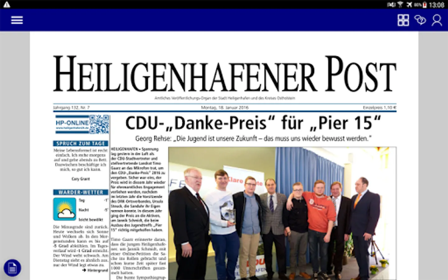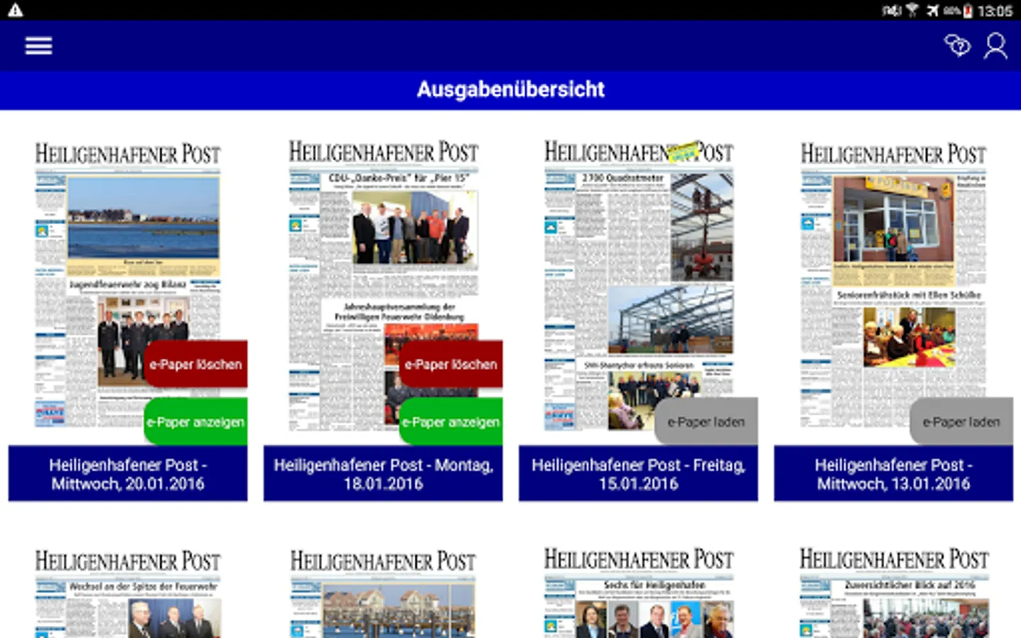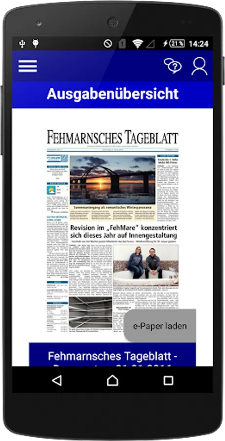 The Fehmarn24 e-Paper App keeps all two editions of the past 14 days of publication in