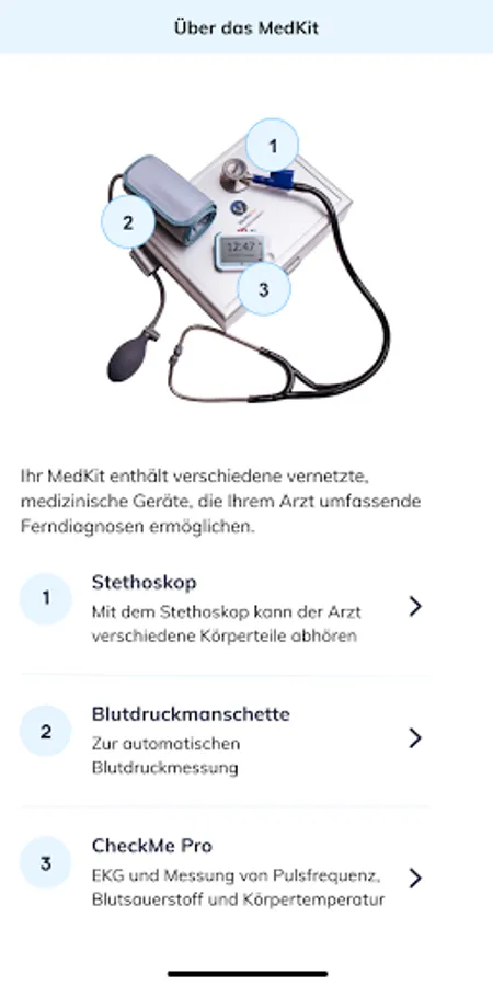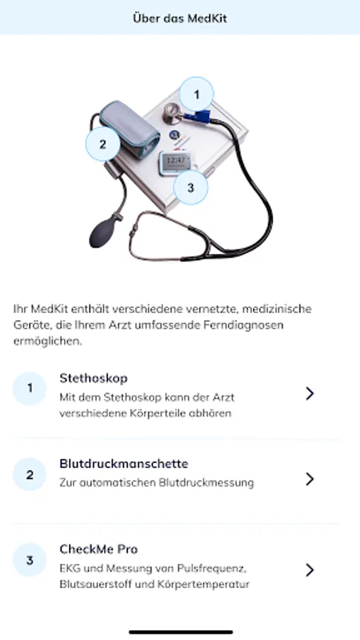 The devices connect via Bluetooth to the MedKitDoc app on your smartphone or tablet. This allows the doctor to listen to you and hear your lung and heart sounds during the video call with the stethoscope, for example.