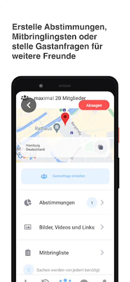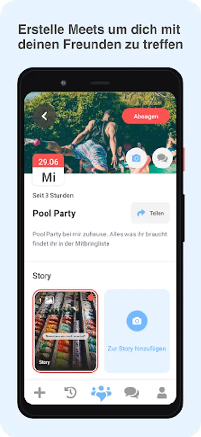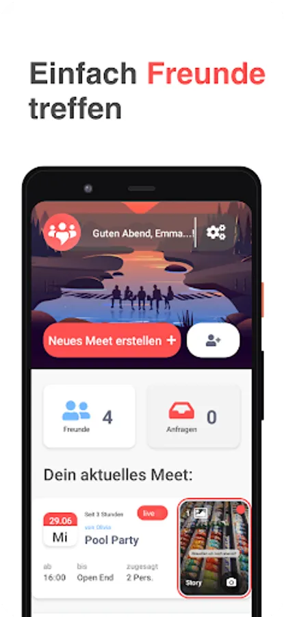 Just create meets to hang out with your friends. In the meets you can then set the time, date, place and all other important information. This can be costs, a limitation of participants or a required Covid-19 vaccination / test.