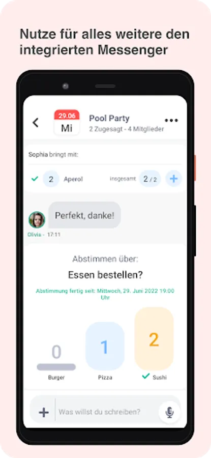 Acami has an integrated messenger with private and group chats. Here you can send messages, voice messages, contacts, pictures and videos. In addition, in the group chat you will always be kept up to date on the latest changes, for example who is bringing something or whether the time has been changed.