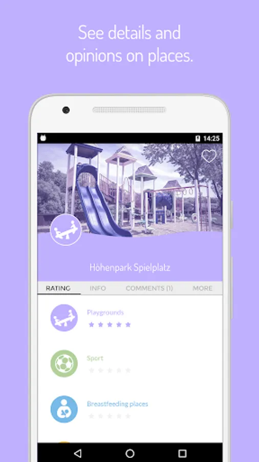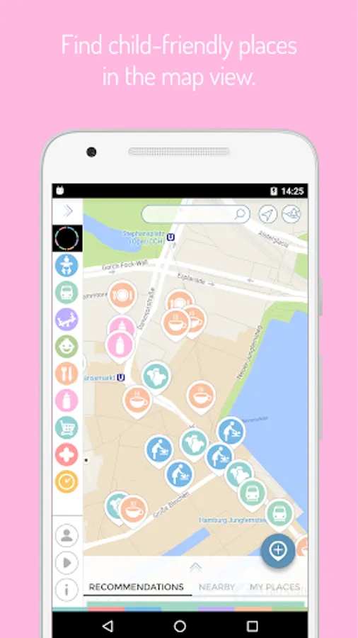 With BabyPlaces you find child-friendly places nearby and on the go – for free! No matter if you’re looking for a place to change your baby’s diaper, a well-liked pediatrician or a nice playground – our smart lists and recommendations by other parents let you find the best places for you and your child.