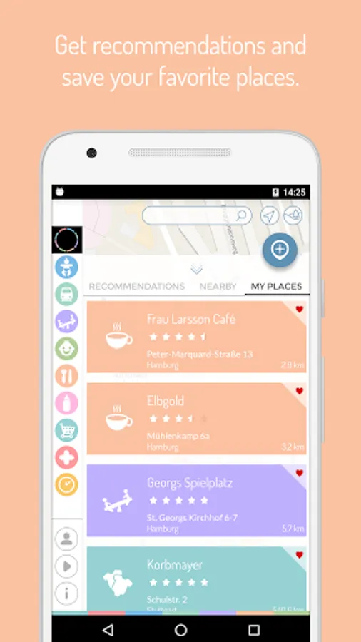 Places that are top rated by other parents or places nearby are shown in our smart lists. On top of that you can save your personal favorite places in a list called „my places“ to make sure you always have them on hand.