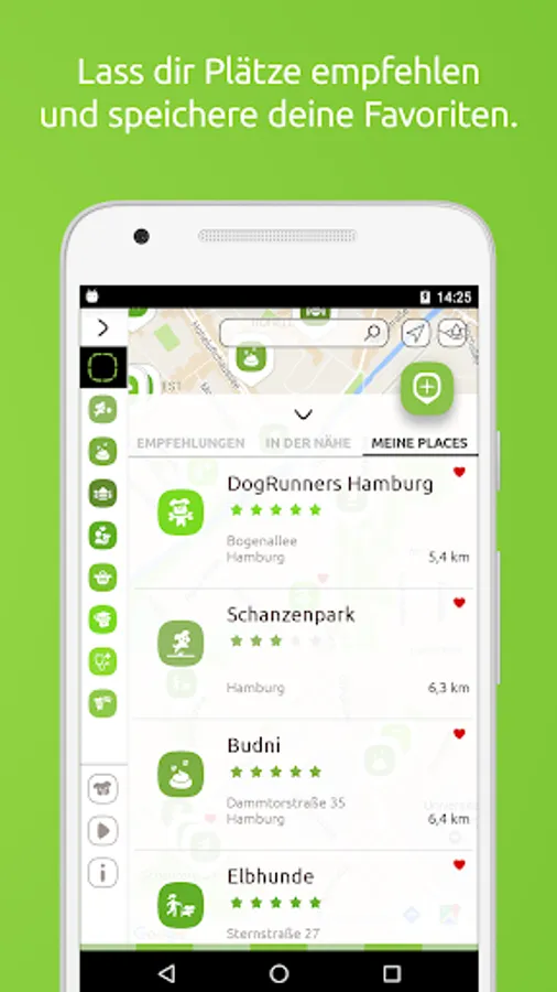 Our lists tell you which places have been rated by other dog owners particularly good or which seats are directly near you. In addition, you can save, so you can find them quickly your favorite places in "My Places".