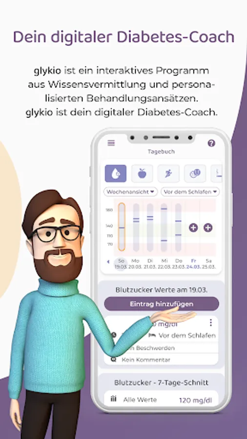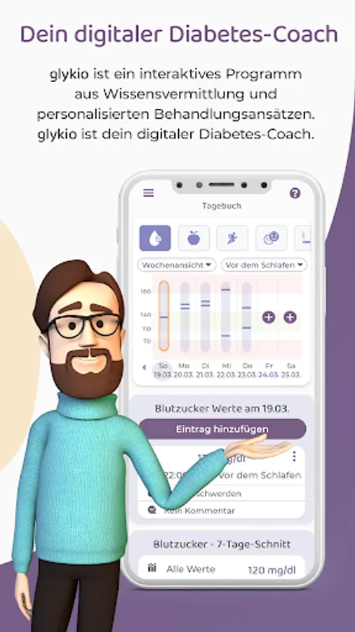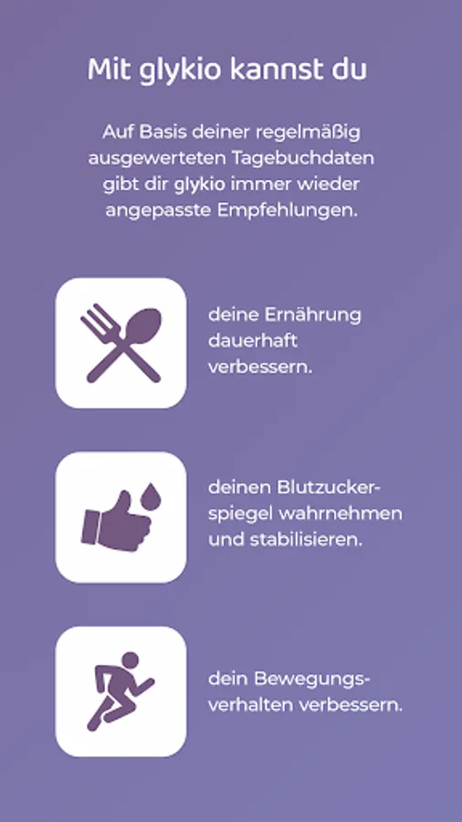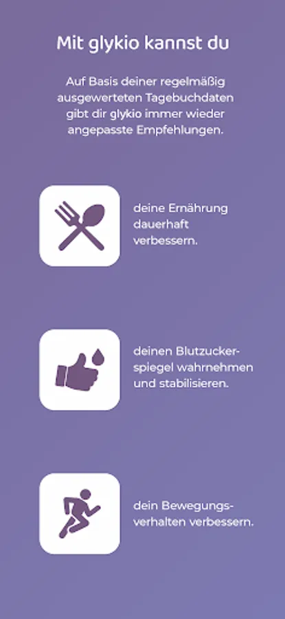 On the way to long-term changes in your lifestyle, you will be accompanied by your digital blood sugar coach, which is powered by an intelligent algorithm. This was developed by scientists and experts for type II diabetes mellitus. You can easily record your progress directly in the app using a digital diary. Based on the diary data, a program tailored to your individual needs will be developed and continually adjusted so that you can improve your blood sugar levels and achieve your goals. Your digital coach will guide you step by step. glykio does not specify a rigid program, but always takes your individual needs into account when compiling the content.