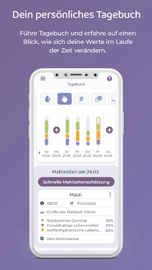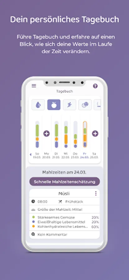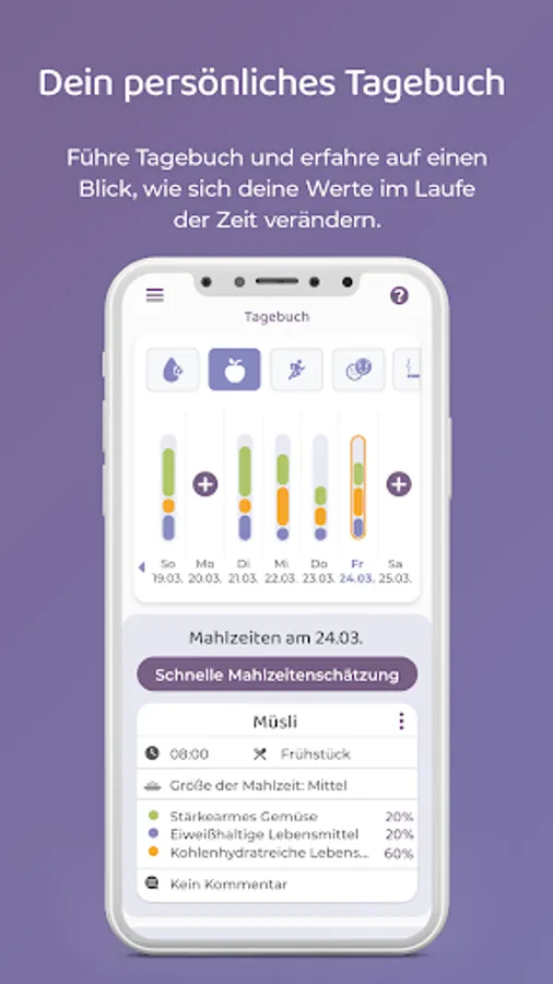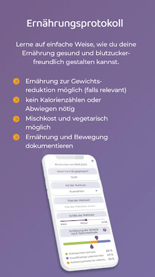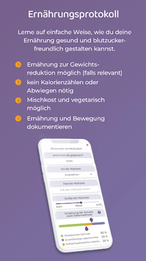 You also have a choice when it comes to changing your diet: You can choose between a light, moderate and strong reduction in carbohydrates and you can choose between a mixed diet and a vegetarian diet. There is no need to weigh food, count carbohydrates or calories: you will have all the important information and tools at hand to be able to change your diet easily and without stress.
