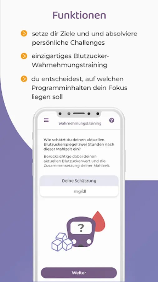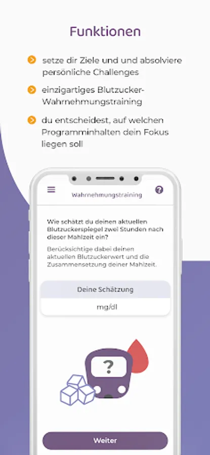 The program does not replace the medical evaluation of the individual patient and the adaptation of diagnostics and therapy to his/her specific situation. The application can be used both as an accompaniment to drug treatment and on its own as an intervention in diagnosed type II diabetes mellitus. In any case, a consultation with your doctor is necessary before the start of the program.