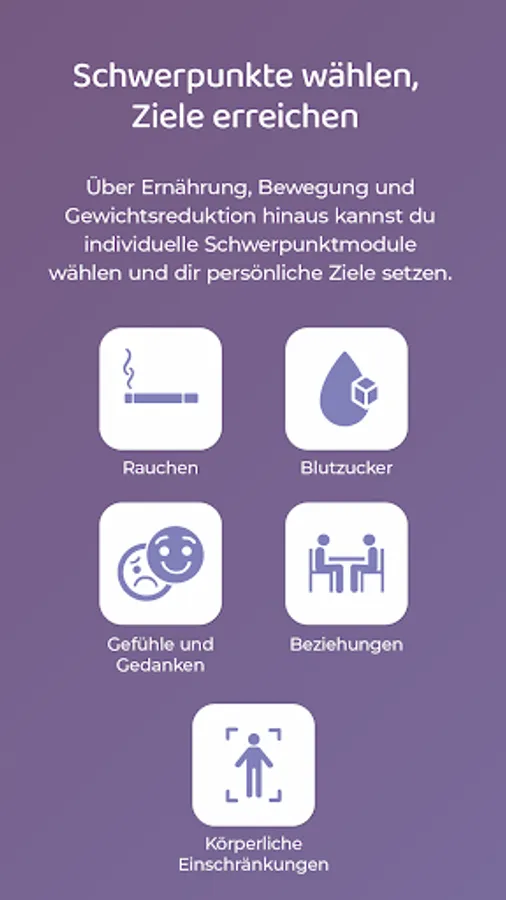 In addition to the basic content on disease knowledge, nutrition and exercise, you have the choice of setting personal goals in various focus areas, which you can link to challenges of your own choice. This makes it even easier for you to stay on the ball.