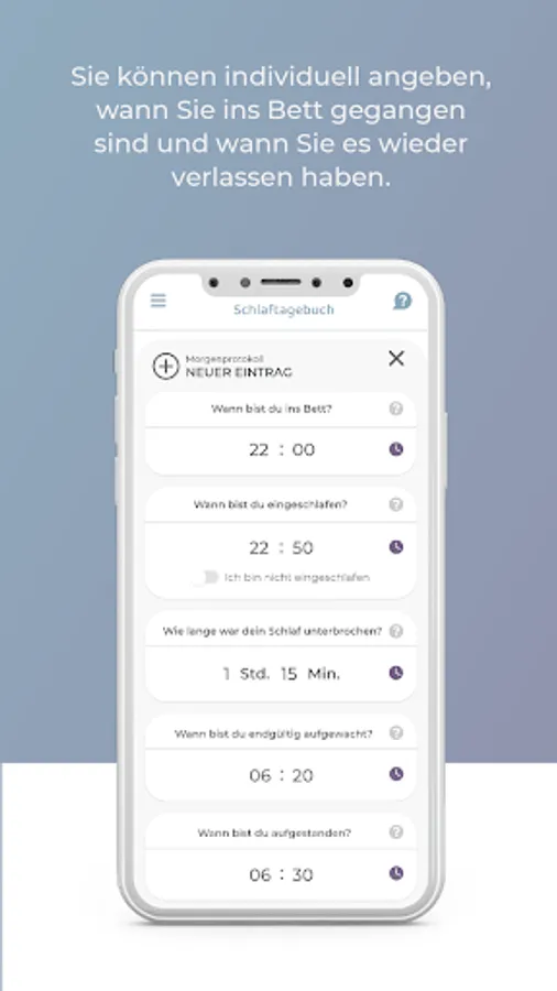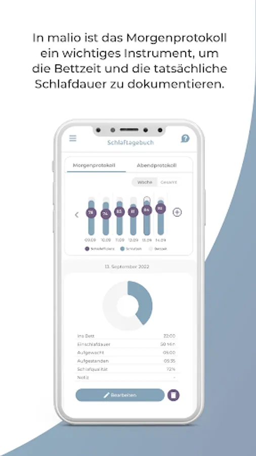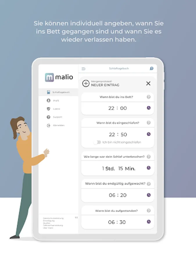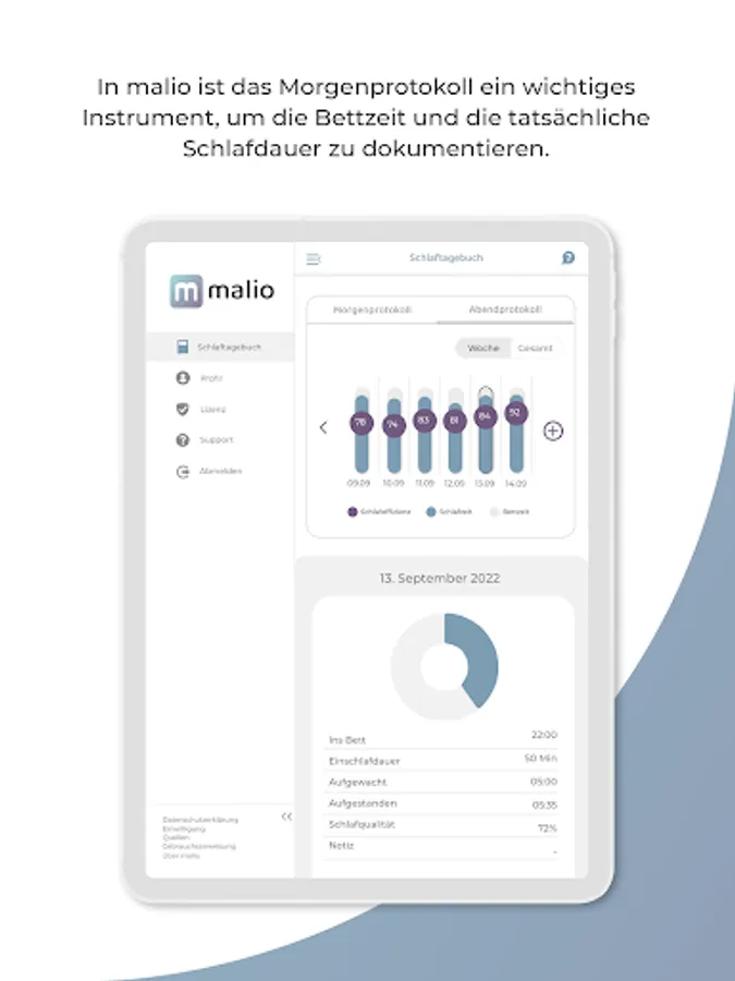 In malio, the morning log is an important tool for documenting bedtime and subjectively perceived sleep duration and sleep quality. It is possible to specify the bedtime and wake-up time individually for each day. Sleep interruptions can also be logged. The daily sleep efficiency is calculated from the information on the sleeping times, i.e. the proportion of the bed time that was actually spent asleep.