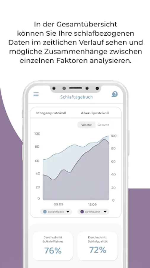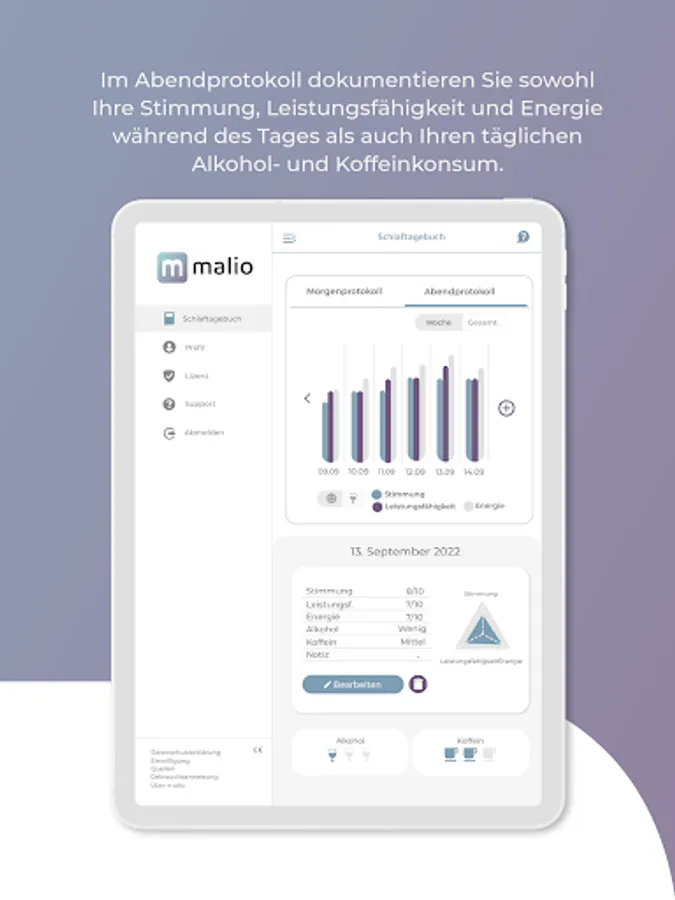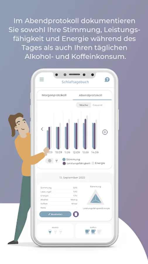 In the evening log, mood, performance and energy can be documented during the day - 3 factors that are influenced by sleep. It is also possible to indicate daily coffee and alcohol consumption, which in turn can have an impact on sleep.