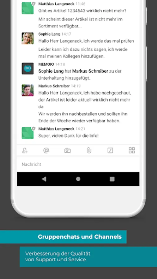 MEMOIO enables easy internal and external communication for you and your company. Group chats provide a fast flow of information, among colleagues as well as in support and service.