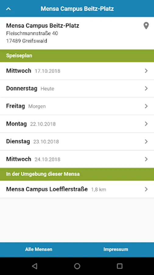 Clicking on the address of your Mensa opens the maps app for the shortest route for lunch on campus.