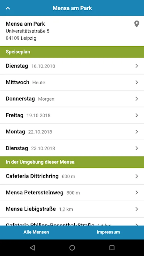 Clicking on the address of your Mensa opens the maps app for the shortest route for lunch on campus.