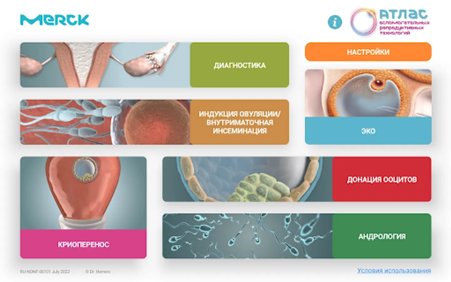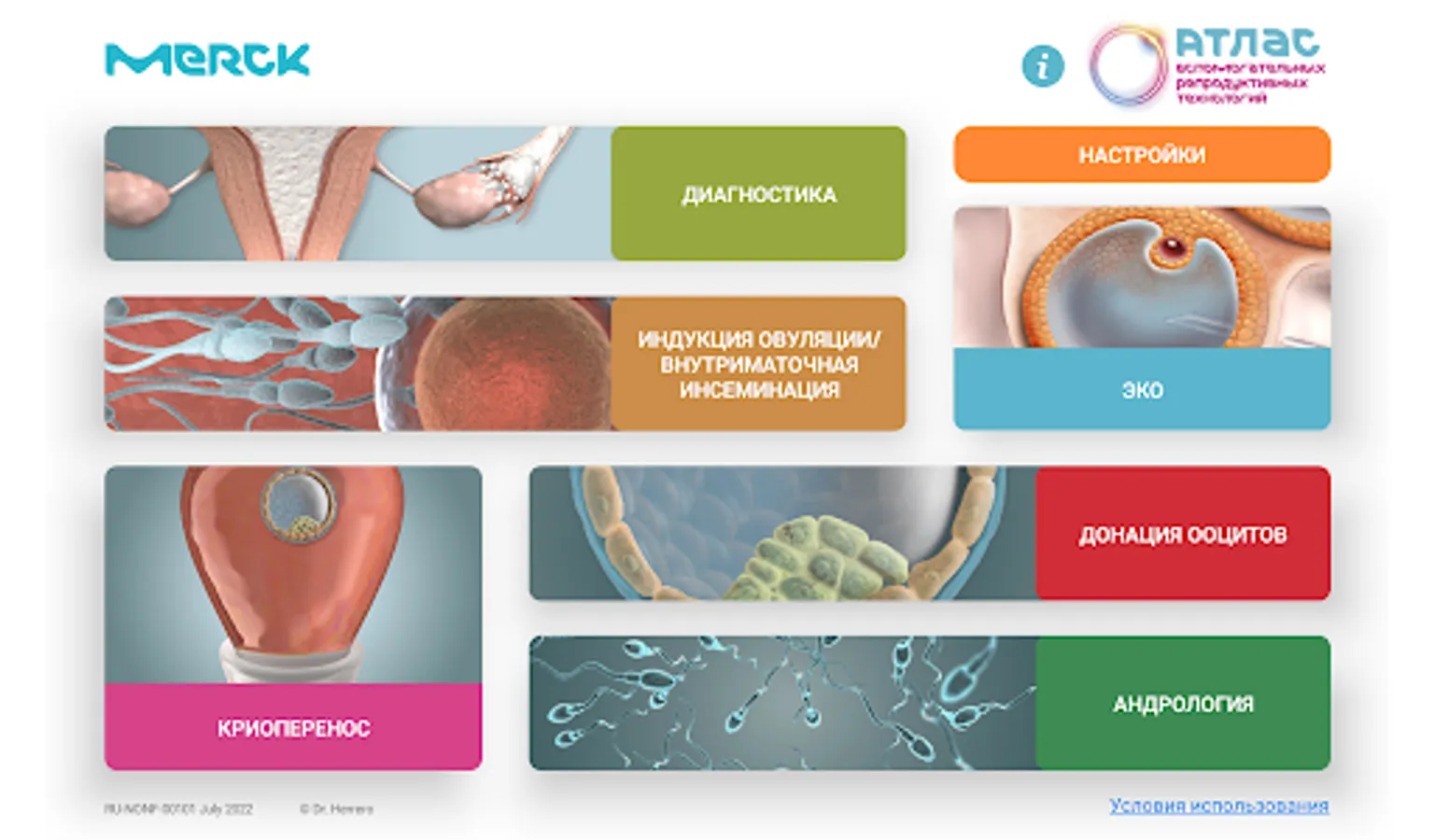 It is a great honor and pleasure for us at MERK to present a new edition of the Atlas of Assisted Reproductive Technologies, based on the original concept of Dr. Julio Herrero (Barcelona, Spain). We would like to thank Dr. Julio Herrero for his initiative to create this useful patient education material, developed with sponsorship and collaboration with MERK KgaA, Darmstadt, Germany. Dr. Julio Herrero foresaw the need to create an Atlas that would help explain to patients the basic anatomy and physiology of the reproductive system, as well as the basic concepts of assisted reproductive technologies (ART), which are regularly used in modern ART clinics for the treatment of infertility. This new edition of the Atlas of Assisted Reproductive Technologies includes 3D graphics, videos and interactive models created electronically to demonstrate egg retrieval, embryo transfer and many other modern ART procedures. You can install and start using the Atlas of Assisted Reproductive Technologies today. Additional registration is not required. We hope you find this tool useful in your daily work.