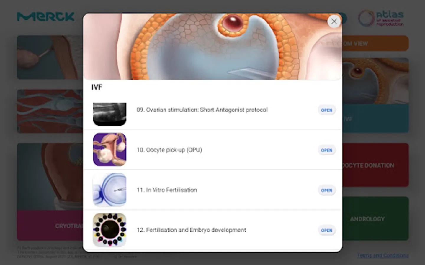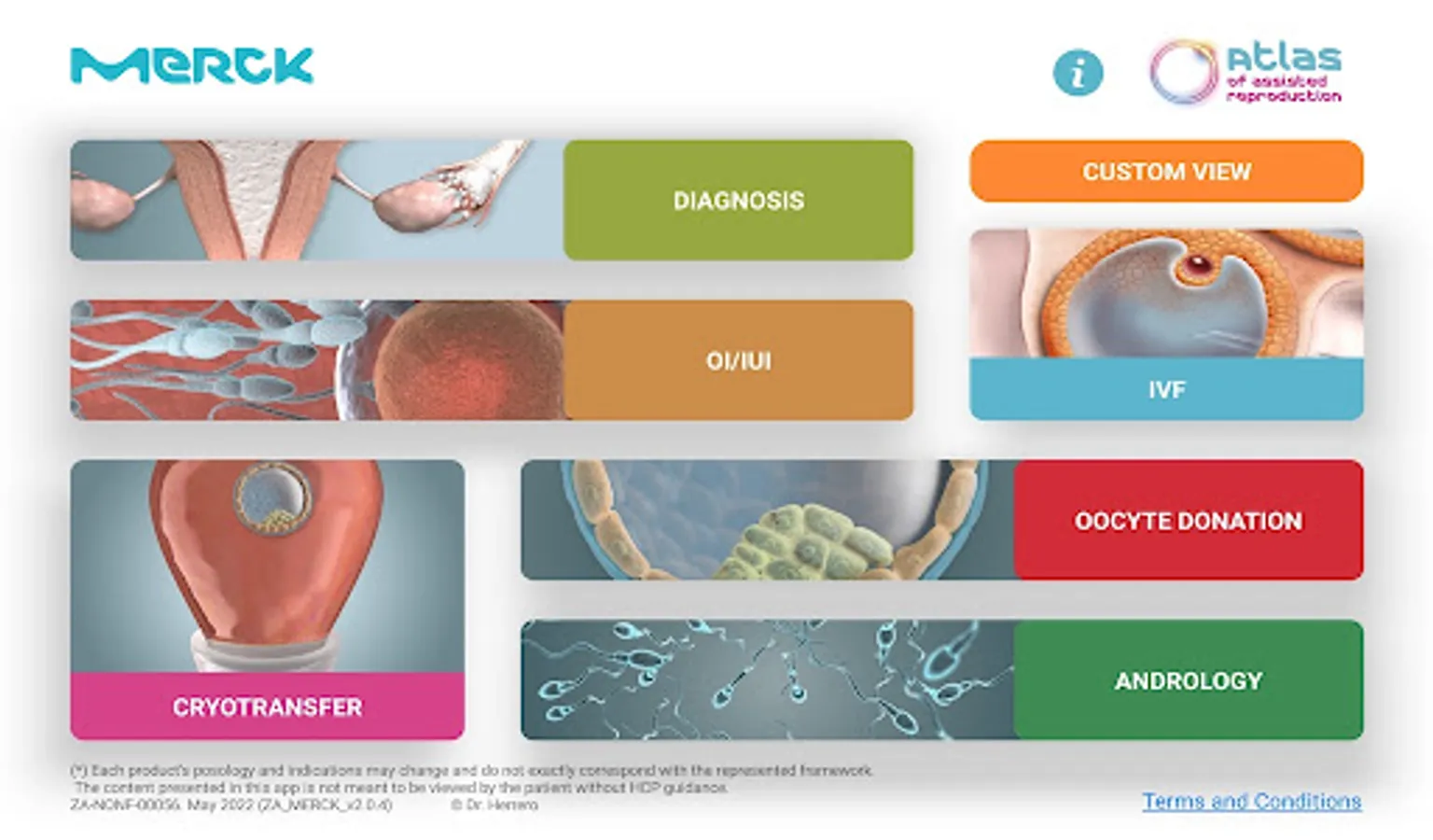 MERCK is pleased to introduce the 4th edition of the Atlas of Assisted Reproduction app, based upon the original concept from Dr. Julio Herrero (Barcelona, Spain). As you may experience in your daily practice, explaining the complex processes of human physiology and reproductive medicine to your patients is not an easy task. Often, it helps to have a visual aid at hand. The Atlas of Assisted Reproduction app is a useful patient education tool which can be used by Health Care Professionals to help easily introduce the basic concepts of ART treatment. The app includes: The app includes interactive 3d graphics, videos and animations, featuring: - Female and male anatomy and physiology. - Examples of the most common protocols of stimulation for IUI, IVF and ICSI. - Common Laboratory procedures and technologies routinely applied in modern ART clinics. We, at MERCK, hope you find this tool useful. Please, contact to your MERCK’s representative to get access to the Atlas of Assisted Reproduction app.