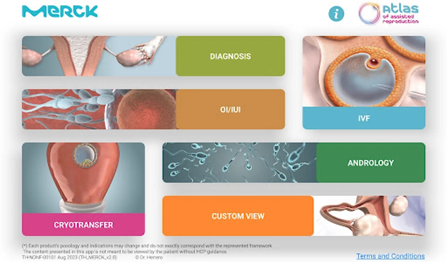 MERCK is pleased to introduce the 4th edition of the Atlas of Assisted Reproduction app, based upon the original concept from Dr. Julio Herrero (Barcelona, Spain). As you may experience in your daily practice, explaining the complex processes of human physiology and reproductive medicine to your patients is not an easy task. Often, it helps to have a visual aid at hand. The Atlas of Assisted Reproduction app is a useful patient education tool which can be used by Health Care Professionals to help easily introduce the basic concepts of ART treatment. The app includes: The app includes interactive 3d graphics, videos and animations, featuring: - Female and male anatomy and physiology. - Examples of the most common protocols of stimulation for IUI, IVF and ICSI. - Common Laboratory procedures and technologies routinely applied in modern ART clinics. We, at MERCK, hope you find this tool useful.