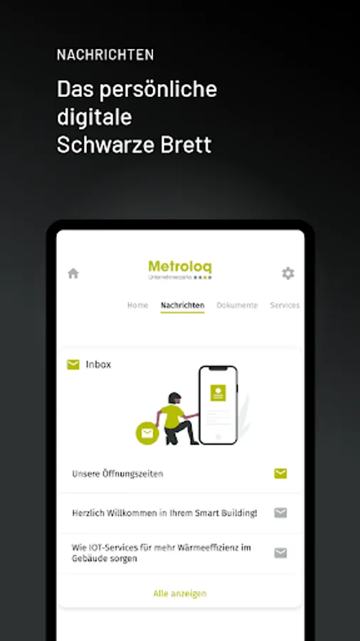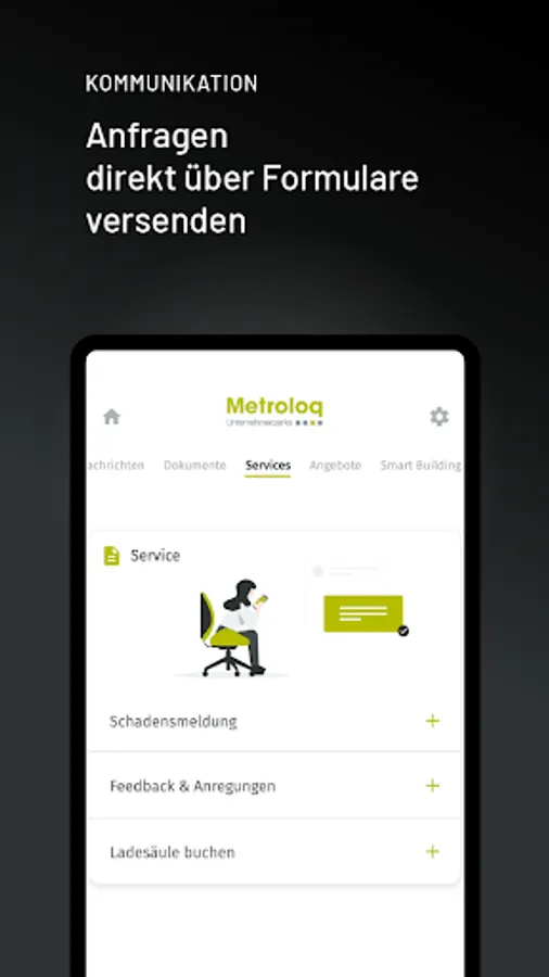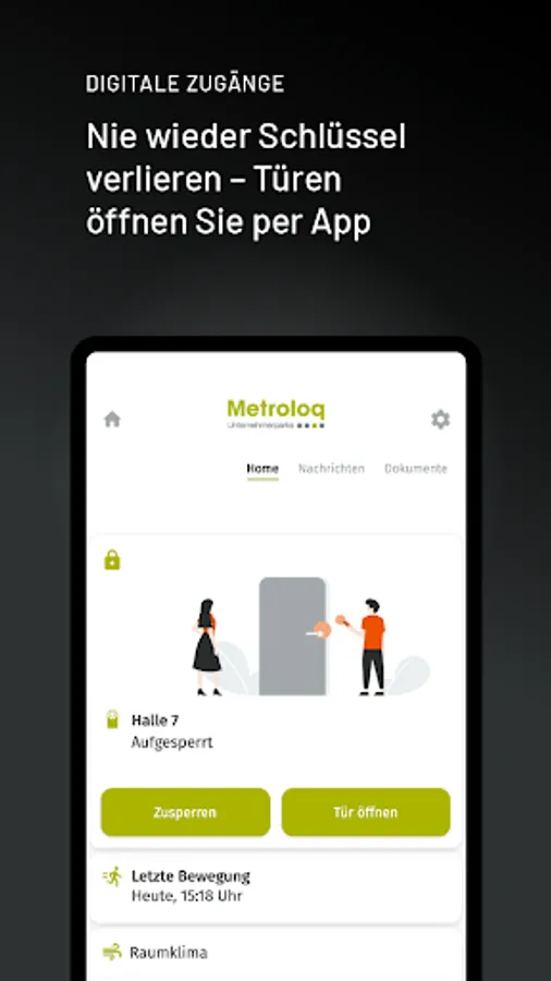 With the Metroloq app, you can use your rental space even more efficiently. Everything in one hand and one app. Control access with your smartphone, communicate with the administration via a ticket system, use our services such as parcel pick-up stations or charging boxes and control smart devices such as lighting, heating or shading.