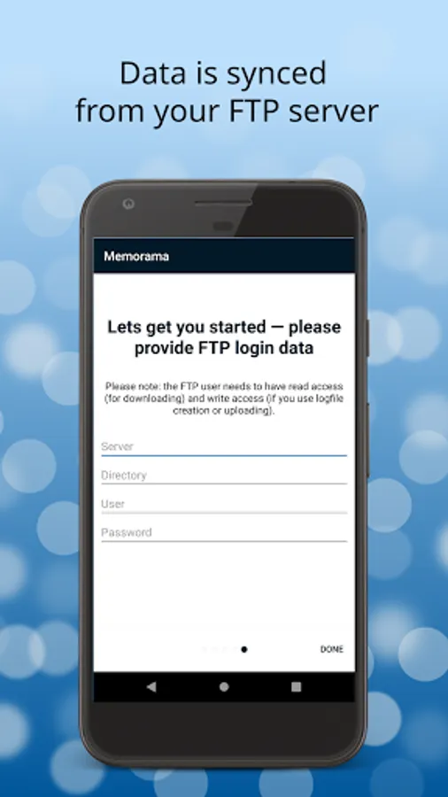 Caution: This app requires a remote SFTP server to work. If you do not have one, you need to set one up first. Most web hosters offer this as a service. Memorama will ask you for your FTP username an password at the first launch and you cannot use the app without.