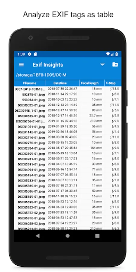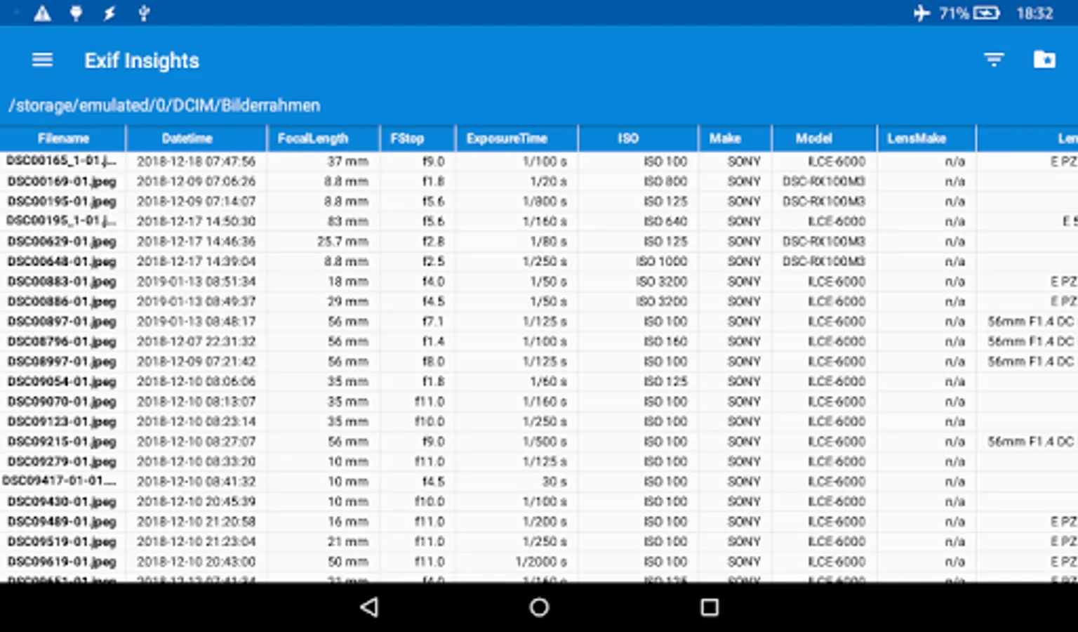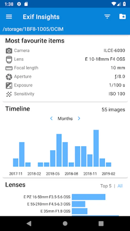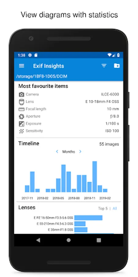 With this app you can analyze the EXIF metadata within your pictures. This will help you to gain insights on your favorite gear or your most common camera settings.