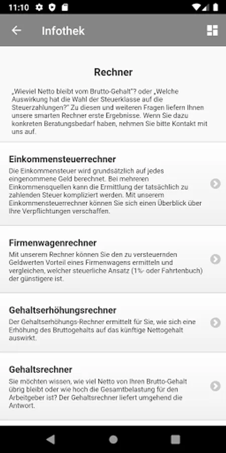 The app also provides information on selected tax law issues: What should be considered when keeping a logbook? What are the options for tax-privileged salary allowances for employees? The app provides you with the answers to these and other topics.