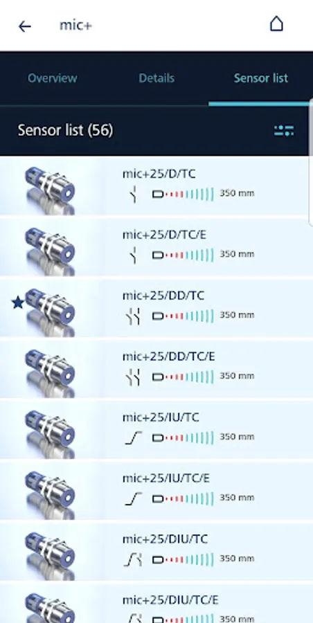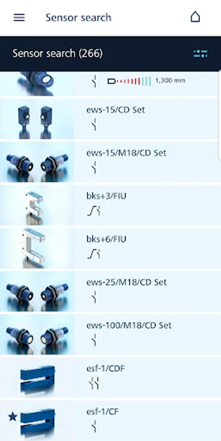 Type directly in the order name of your ultrasonic sensors and look for technical details or choose from several hundred sensors by criteria “family”, “operating mode”, “output”, “design”, “further versions” and “distance to object (mm)”. Add your chosen sensors to your favorites within the app.